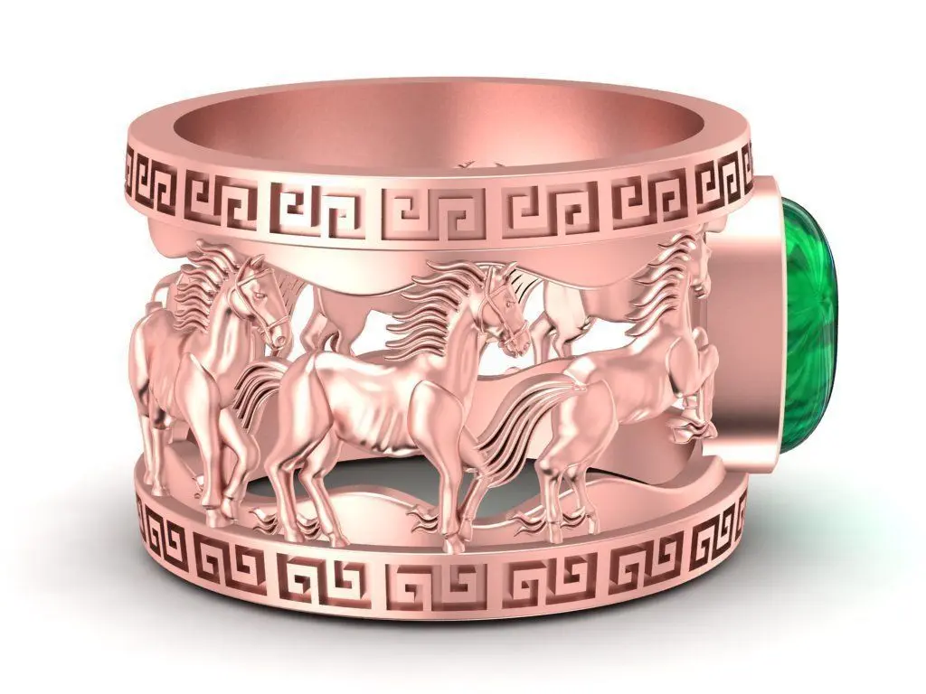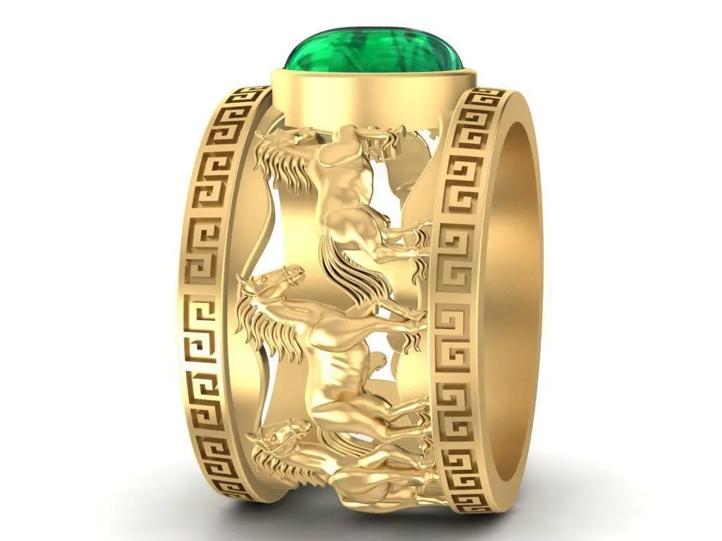 This Luxury Horse Symbol Oval Gemstone Ring for Men is a high-quality CAD model designed for professional jewelry production. The ring features a bold oval center stone set in a solid, detailed band decorated with running horse motifs and traditional geometric patterns. The sculpted horse figures create a strong masculine aesthetic, making this design suitable for statement pieces and high-end collections.