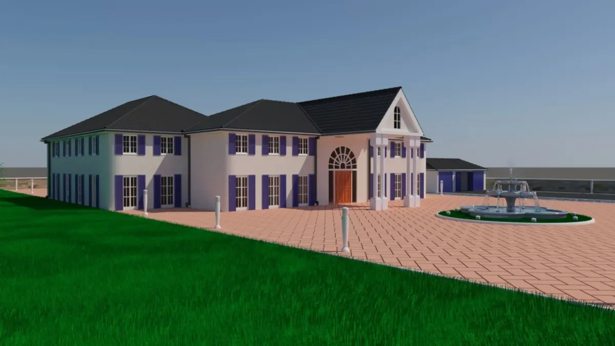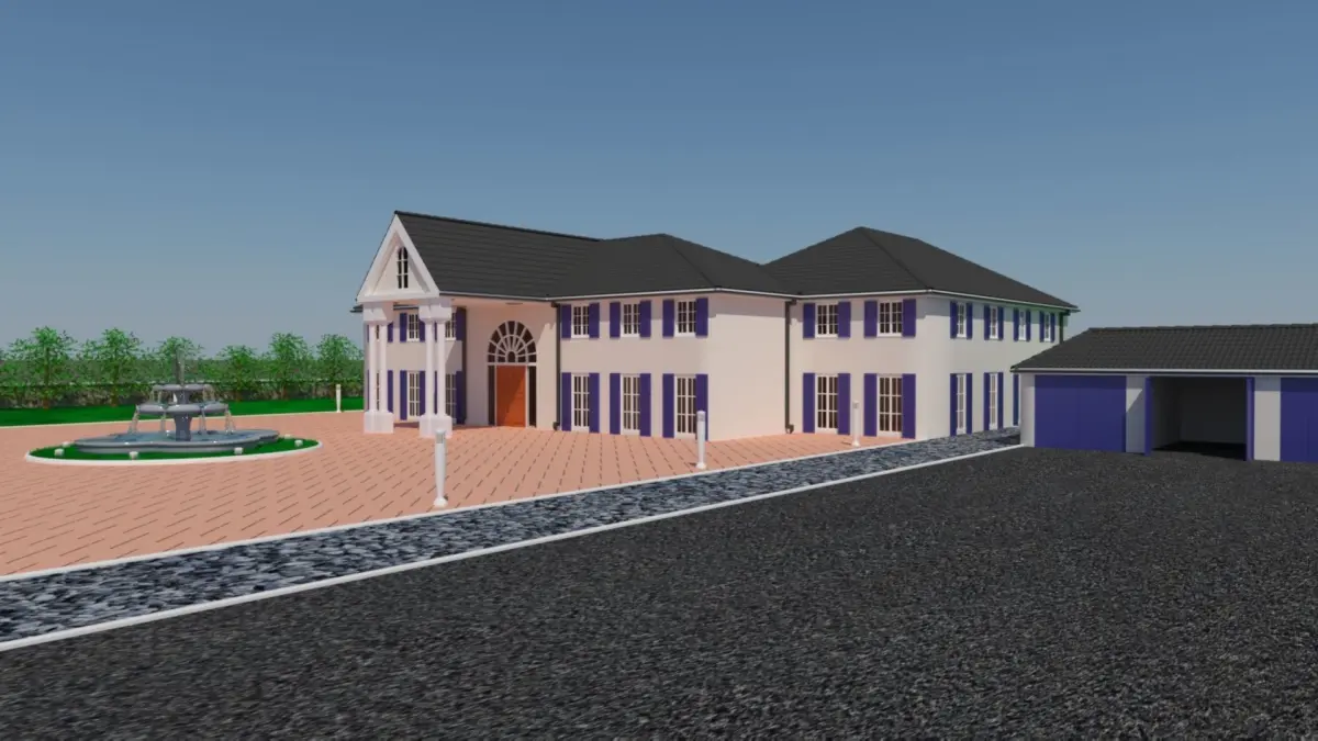 Large Luxury house/mansion with three car garage, swimming pool with water feature and front garden water fountain.This large home has two levels and twelve rooms with a double helix spiral staircase in the main lobby.The gardens are simple and open with a brick work paving centre, tarmac driveway edged with grass and trees all surrounded with a low wall.