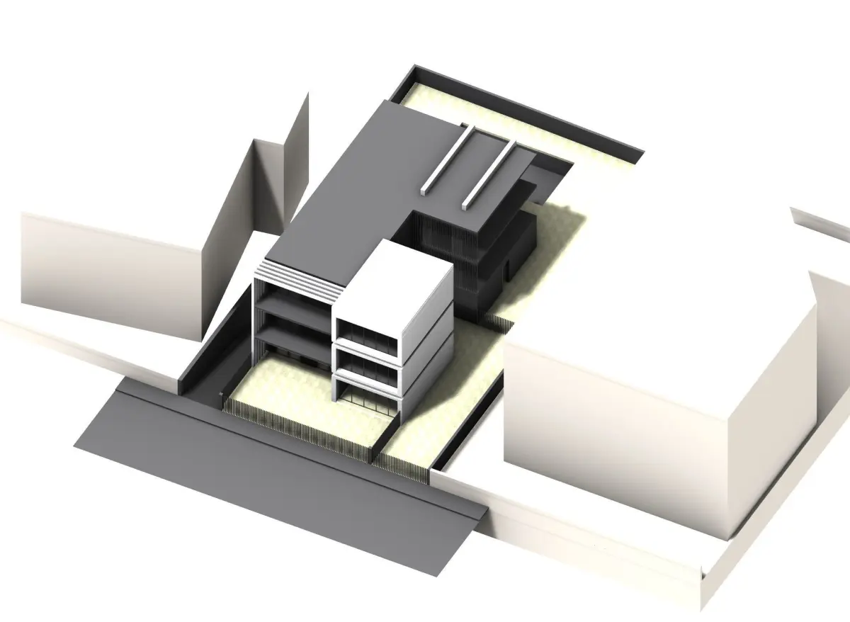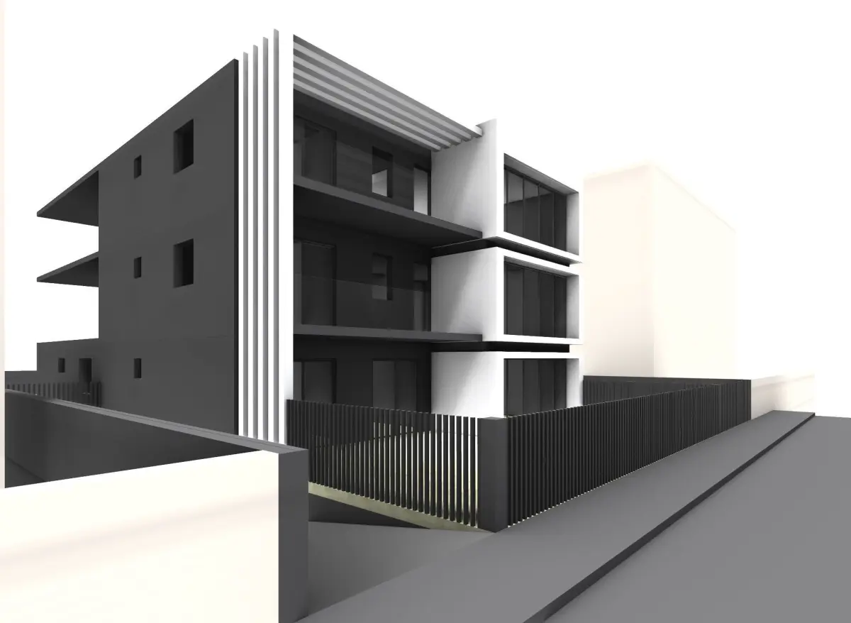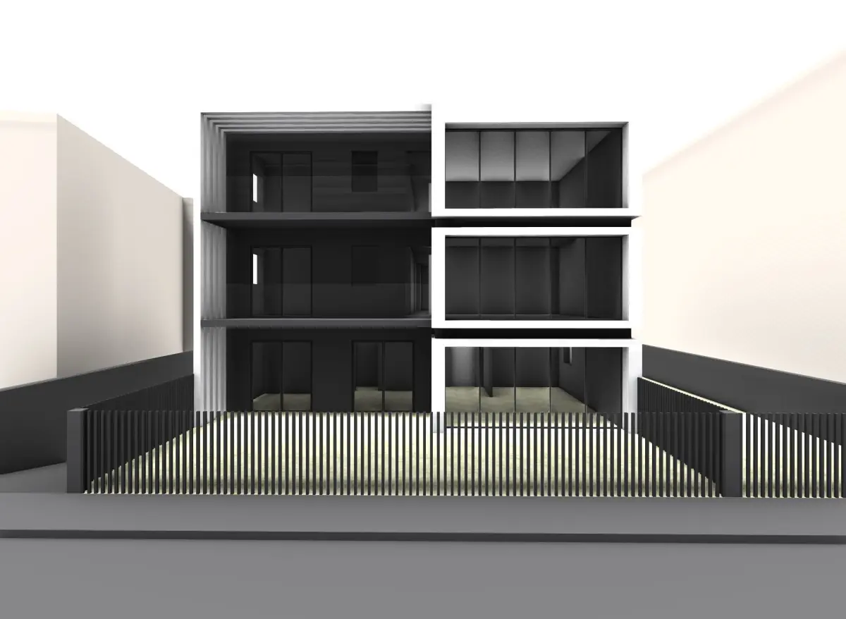 4-unit apartment building. there is a pool in the back garden as well. The color combination provides a futuristic aesthetic while the strong contrast of black and white result in a modern and minimal look.