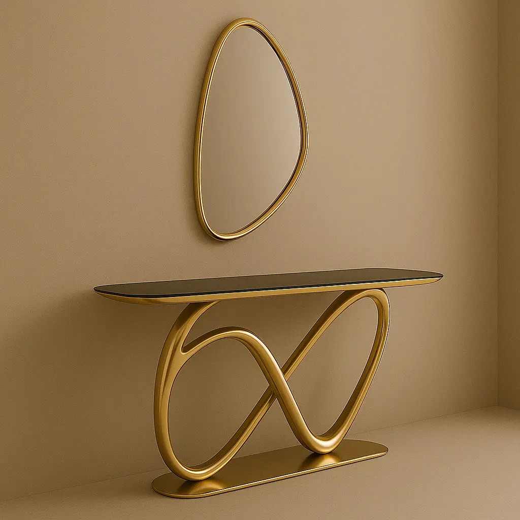 Description:This luxury infinity console and mirror set is a high-end 3D model designed for luxury interiors, product visualization, and architectural renders. The console features an elegant infinity loop-inspired base with a smooth reflective finish, complemented by a soft-shaped gold-framed mirror.