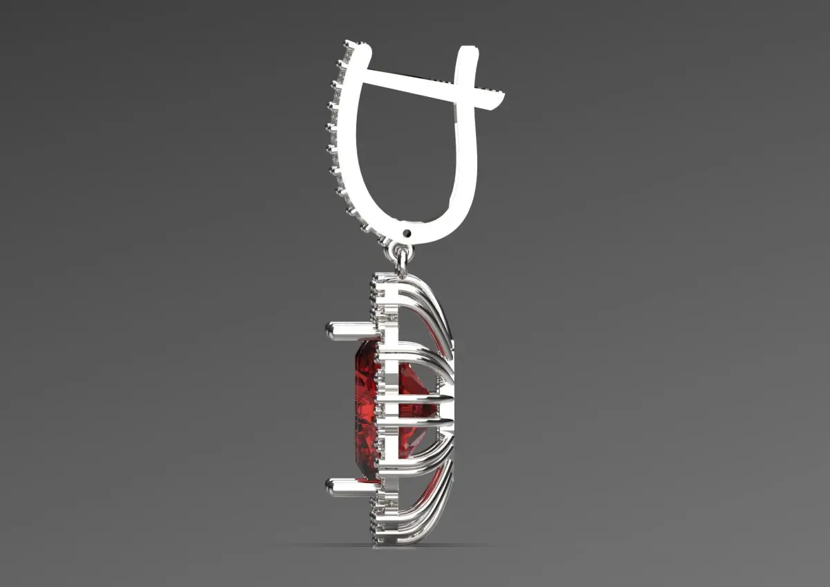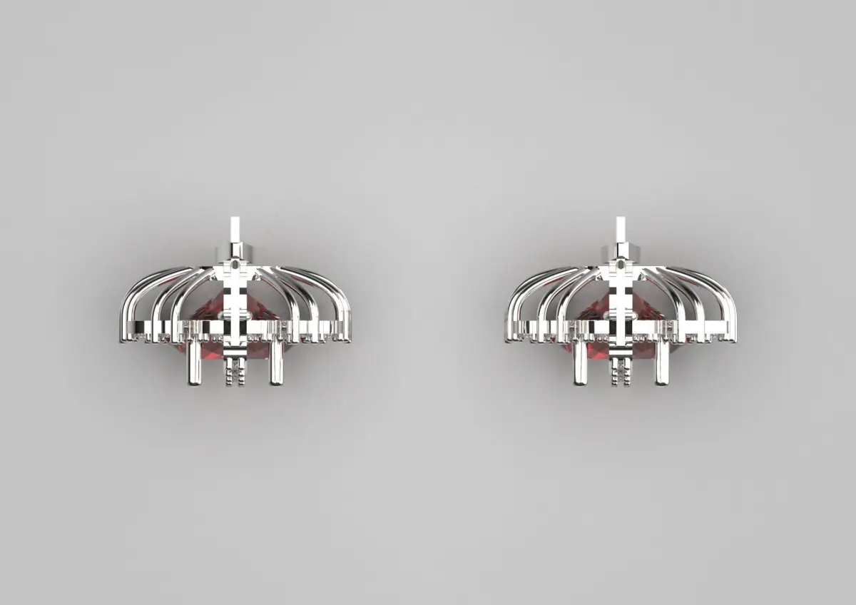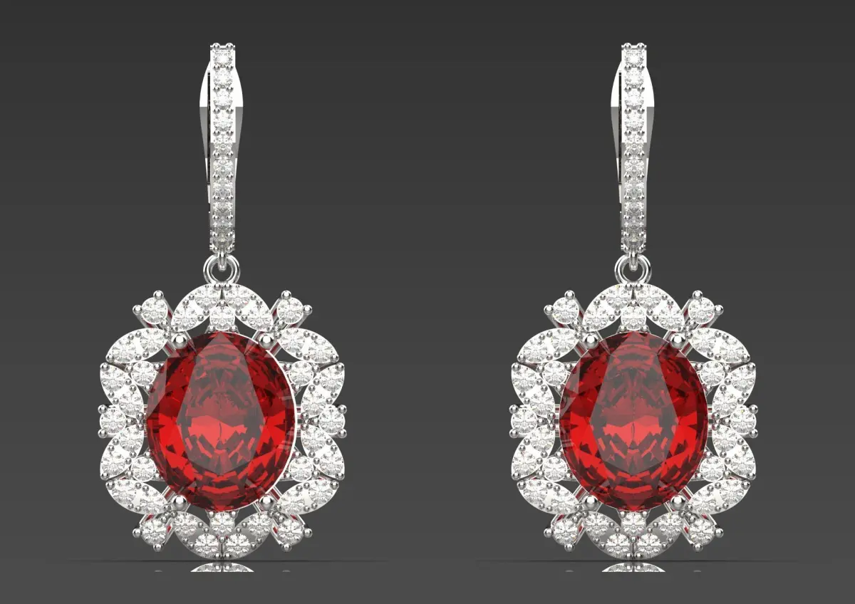 This earring features a stunning design that beautifully combines elegance and glamour. Each earring features a brilliant red ruby gemstone, beautifully cut into an oval shape, set at the center. The deep red color of the stones adds rich warmth and striking contrast to the surrounding elements.