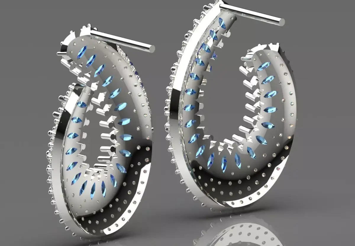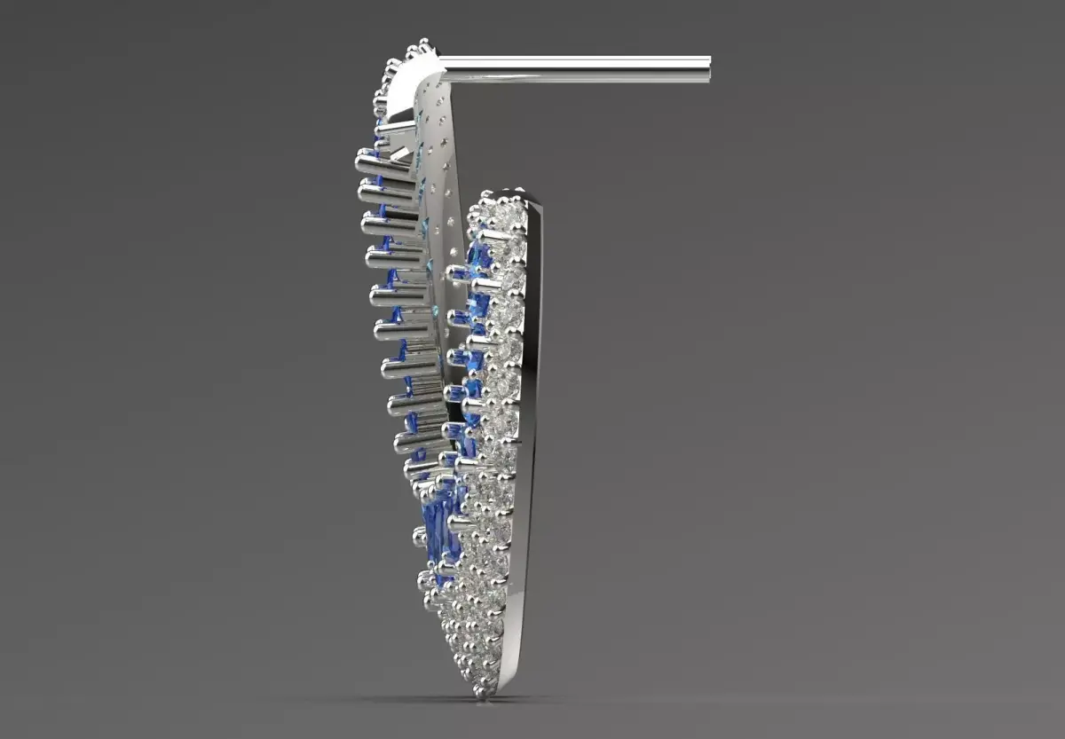 Diamonds: A large number of small round diamonds with a brilliant cut (Round Brilliant Cut) that are set densely and pavé in two rows (one inside and one outside) on the entire metal surface of the earring (except for the blue gems).