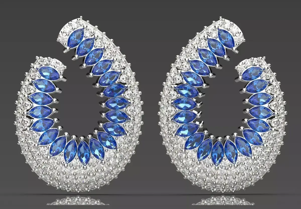 This pair of earrings features a striking design in the shape of a large drop or cove with jagged edges and a wave or waterfall-like design. The main body of the earring is made of silver metal (possibly white gold) and is covered with sparkling diamonds. At the center of the design is an inner row of Marquise Cut sapphires (or similar blue stones) that create a beautiful color contrast with the diamonds. These earrings are ideal for formal occasions, evening parties, and those looking for a piece of jewelry with lots of sparkle, a unique design, and a luxurious color combination.