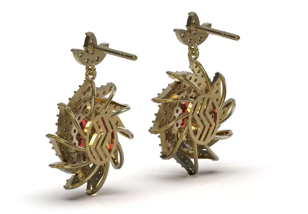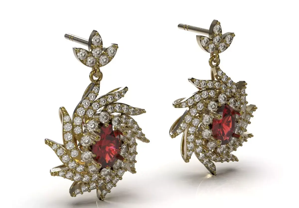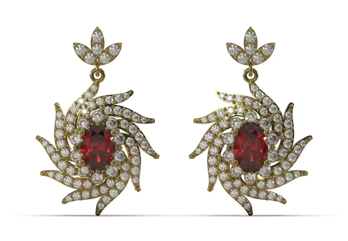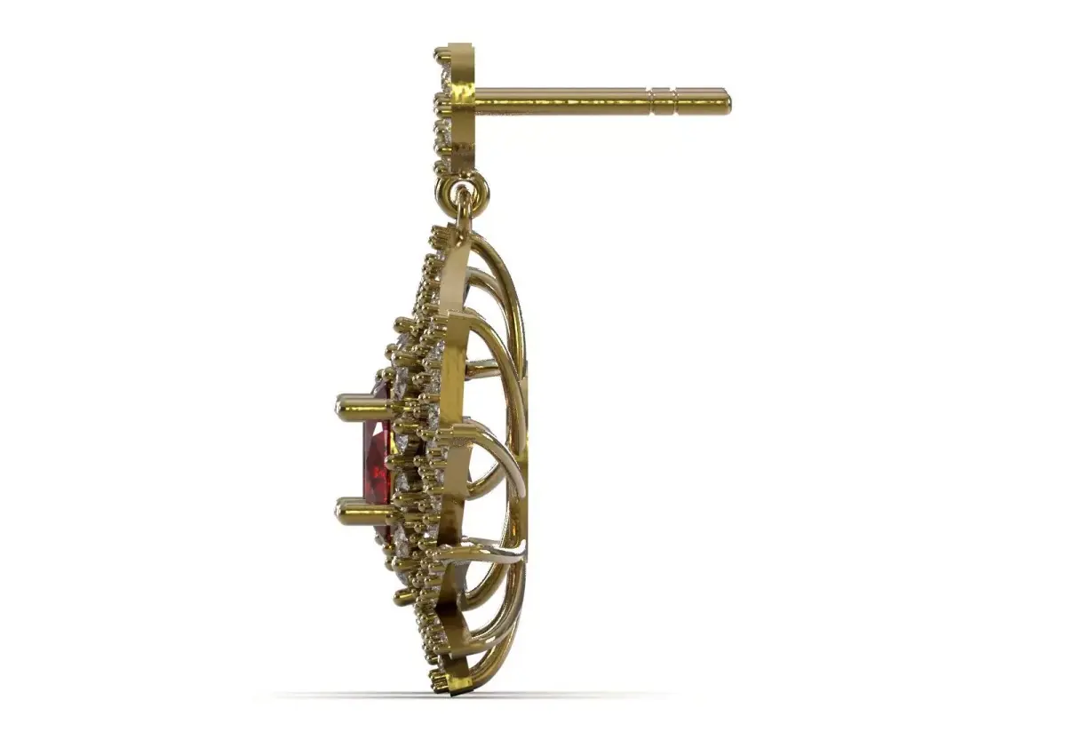 Center Stone: In the center of the drop element, an oval or round deep red/ruby-like gemstone is set in a prong set.