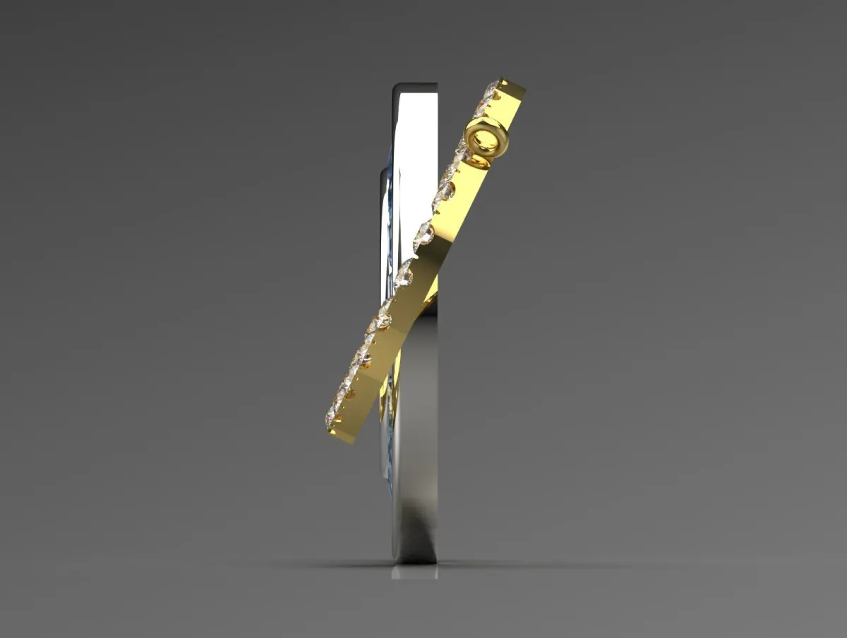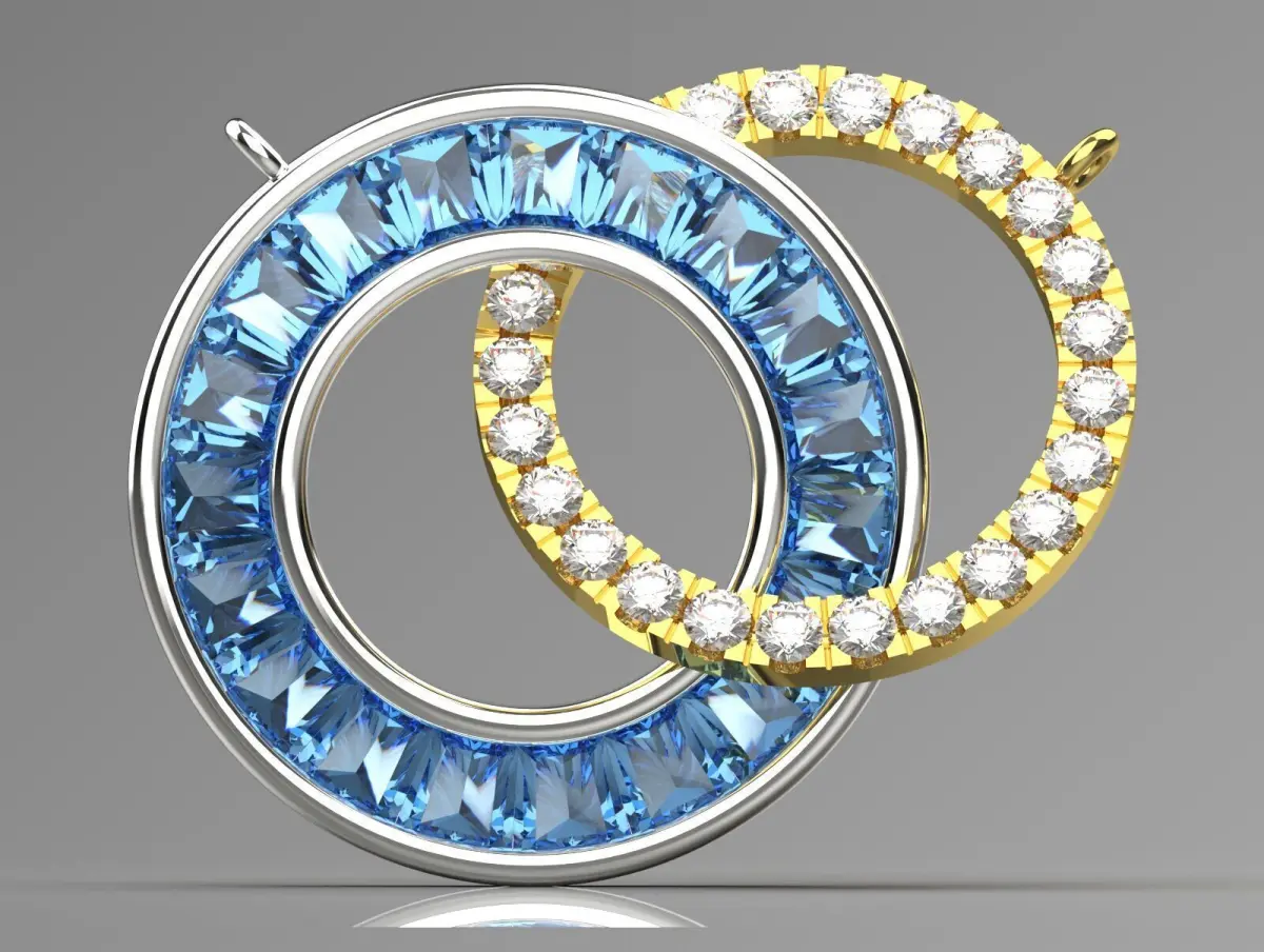 The image depicts a 3D digital rendering of two interlocked rings, resembling a jewelry or decorative piece. One ring appears to be silver-colored and has a series of square-cut blue gemstones embedded around its circumference. The other ring is gold-colored with a series of small, round yellow gemstones embedded around its circumference. The rings are positioned in such a way that they intersect and create a visually appealing pattern against a dark gray background. The overall design suggests elegance and luxury, possibly inspired by wedding or anniversary jewelry.