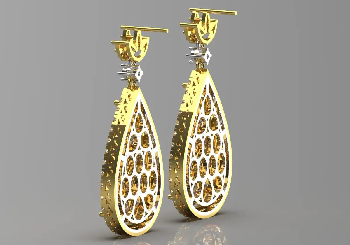 These earrings are a stunning example of luxurious design, featuring a teardrop shape that is both eye-catching and delicate. The earrings are crafted from yellow gold, which gives the earrings a warm and radiant glow. Intricate gold-work details, with delicate filigree designs adorning the outer edges, add a touch of sophistication.
