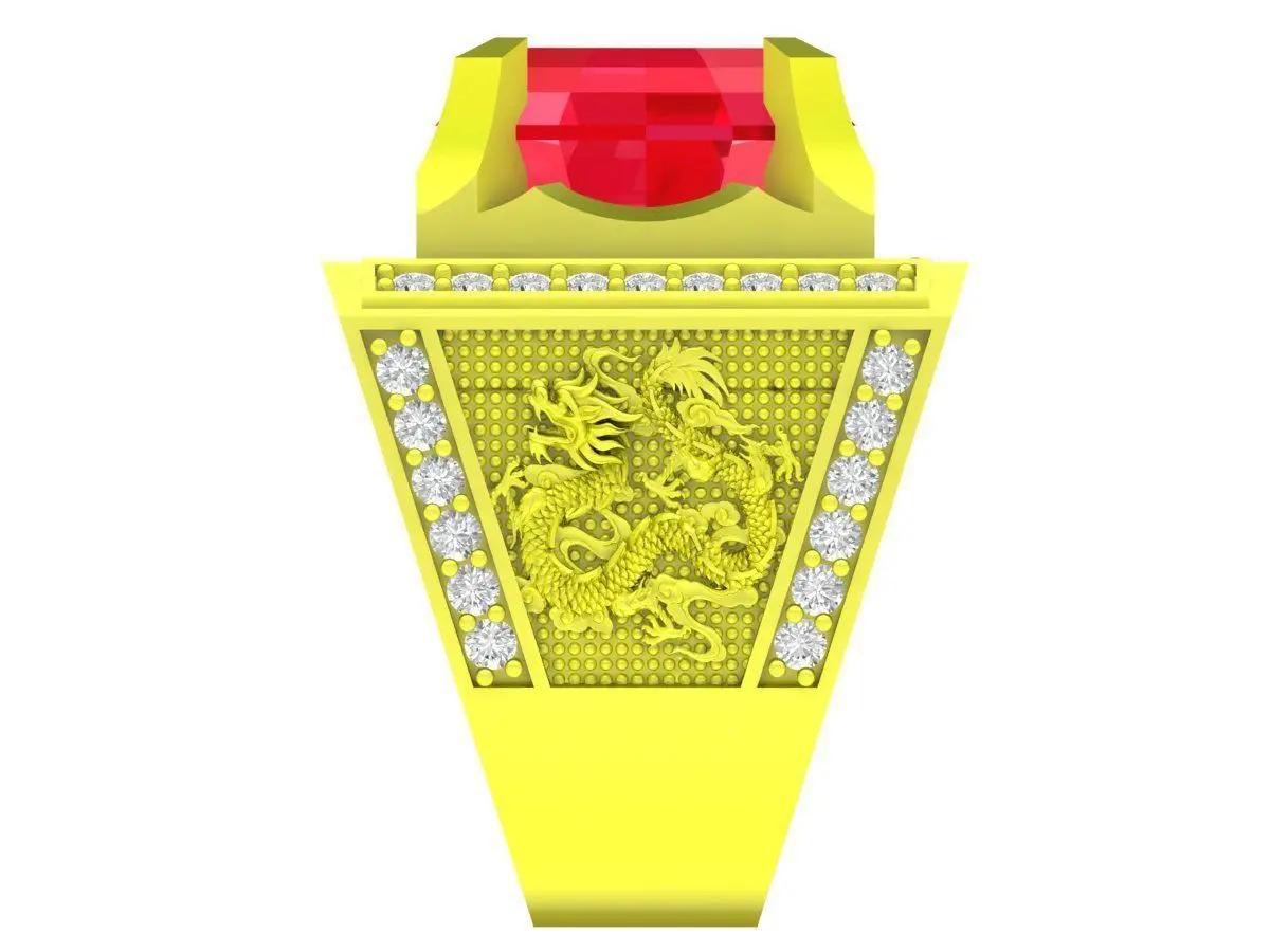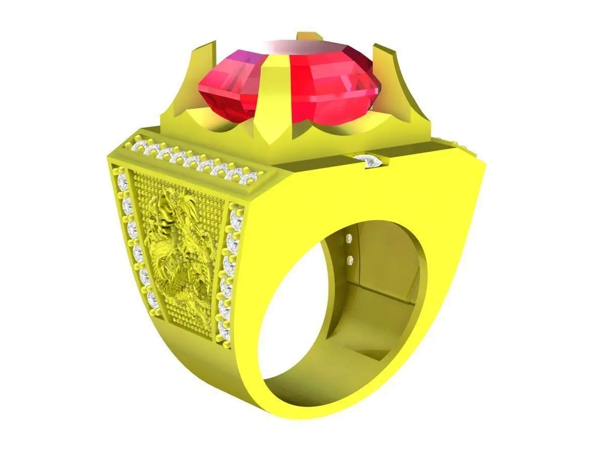 This luxury large gemstone signet ring 3D model features a bold and powerful design centered around a prominent faceted gemstone. The elevated stone setting creates strong visual impact, while the solid signet-style band enhances durability and masculine character. Decorative engraved details along the ring sides add depth and artistic refinement to the overall composition.
