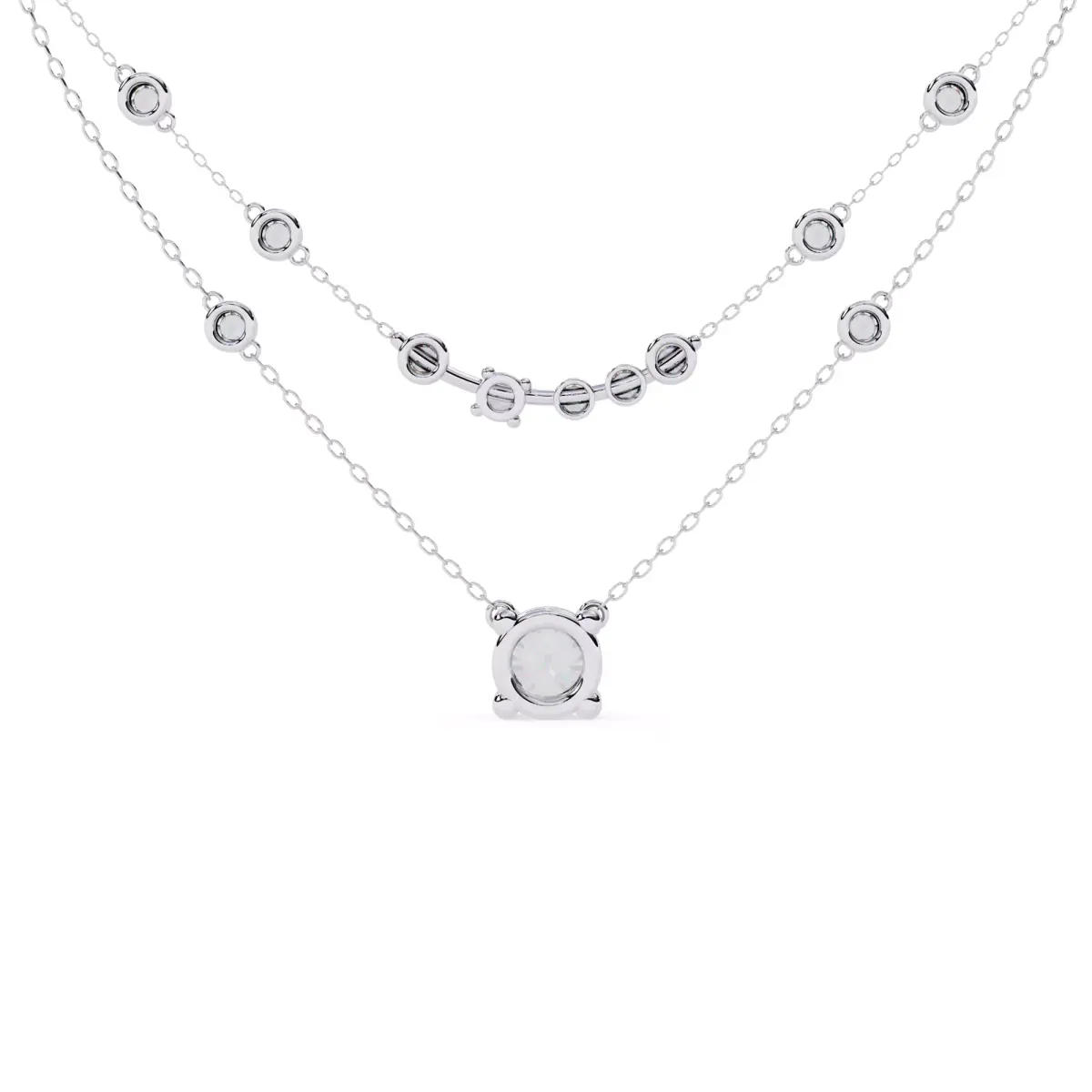 The upper layer adds sparkle and balance with evenly placed round stone elements, while the lower layer highlights a bold central diamond setting that enhances the overall luxury appeal. This combination creates a timeless yet modern necklace design ideal for high-end jewellery collections.