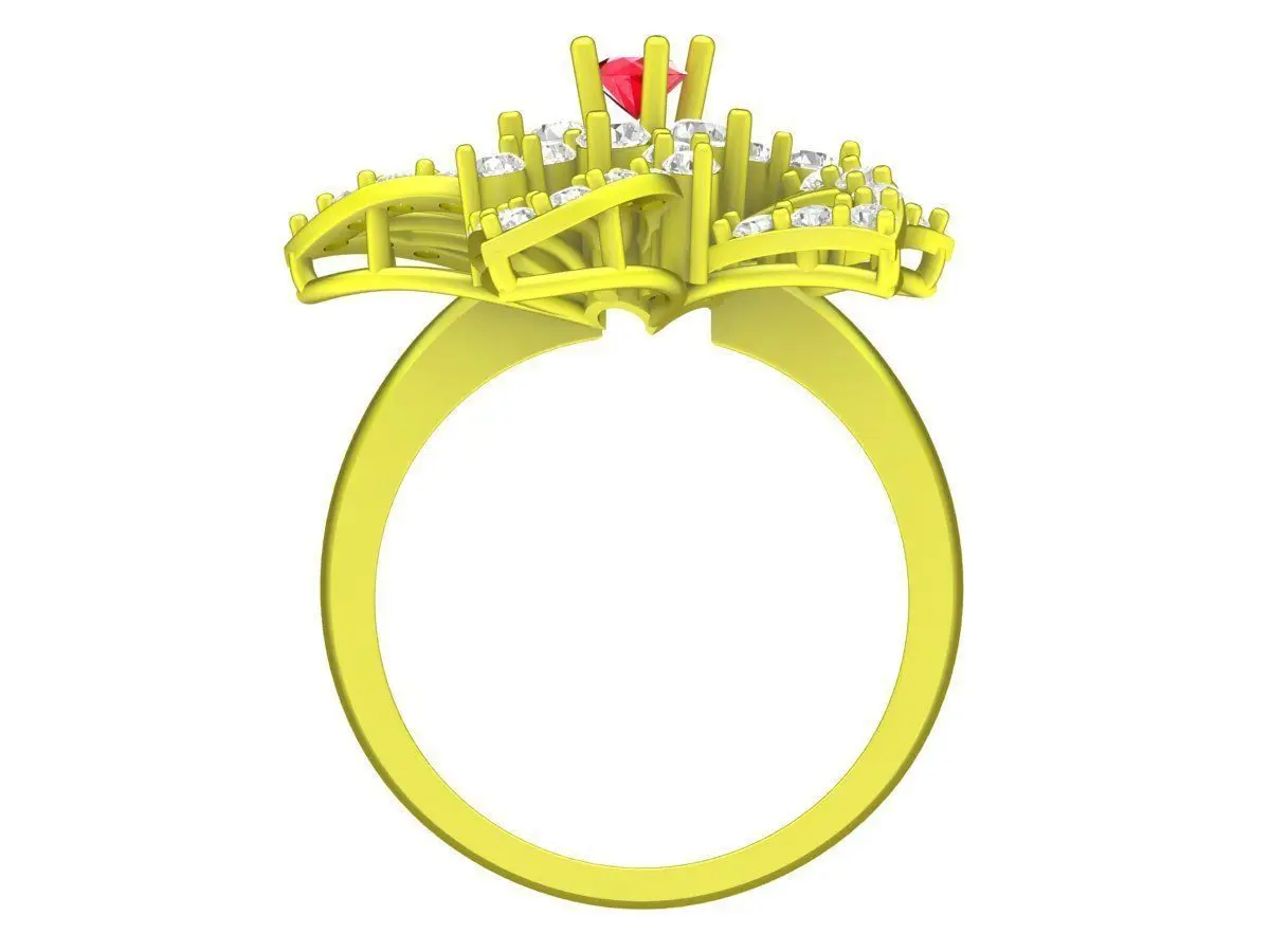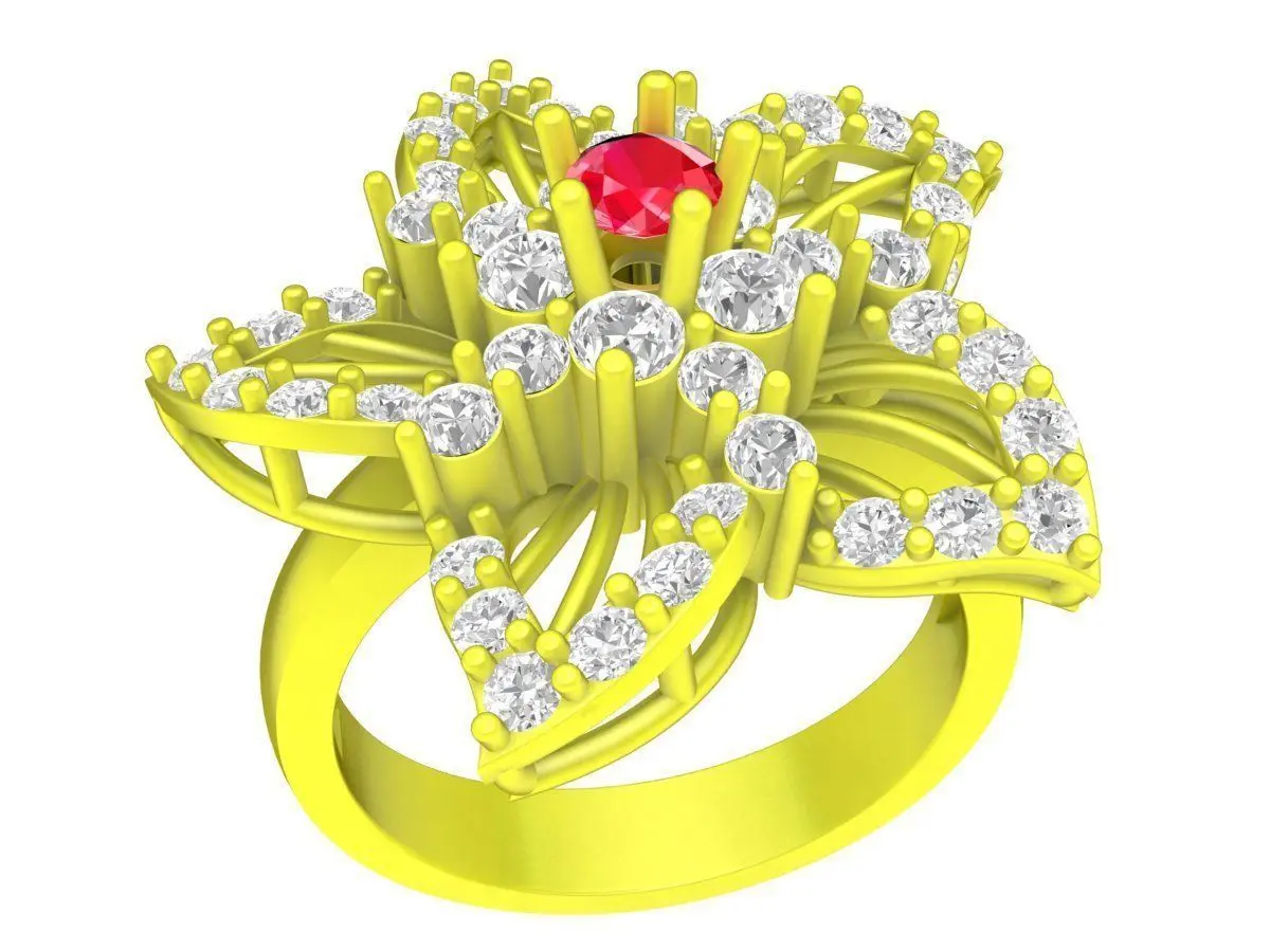 This luxury layered floral gemstone ring 3D model showcases an intricate flower-inspired design with multiple sculpted petals arranged in a dynamic, multi-level composition. The layered structure creates strong depth and movement, while pavé-set accent stones enhance brilliance and highlight the elegant floral form. A refined center gemstone adds a focal point and completes the luxurious aesthetic.