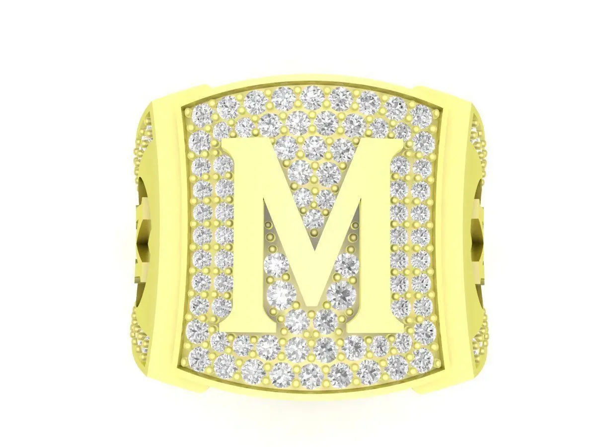 This luxury letter M ring 3D model features a bold rectangular top design accented with pavé-set stones surrounding a raised letter centerpiece. The clean geometry and balanced proportions create a strong, modern statement ring suitable for personalized and initial-based jewelry collections.