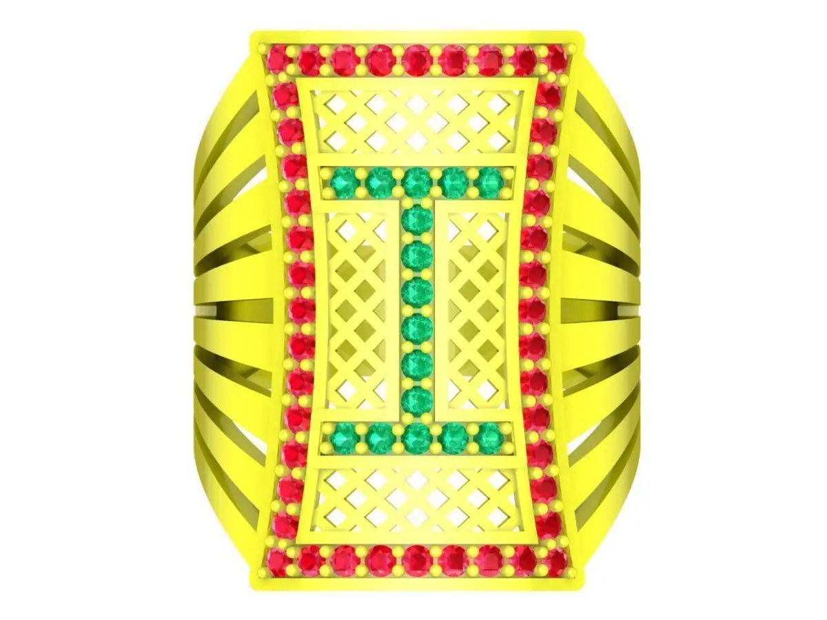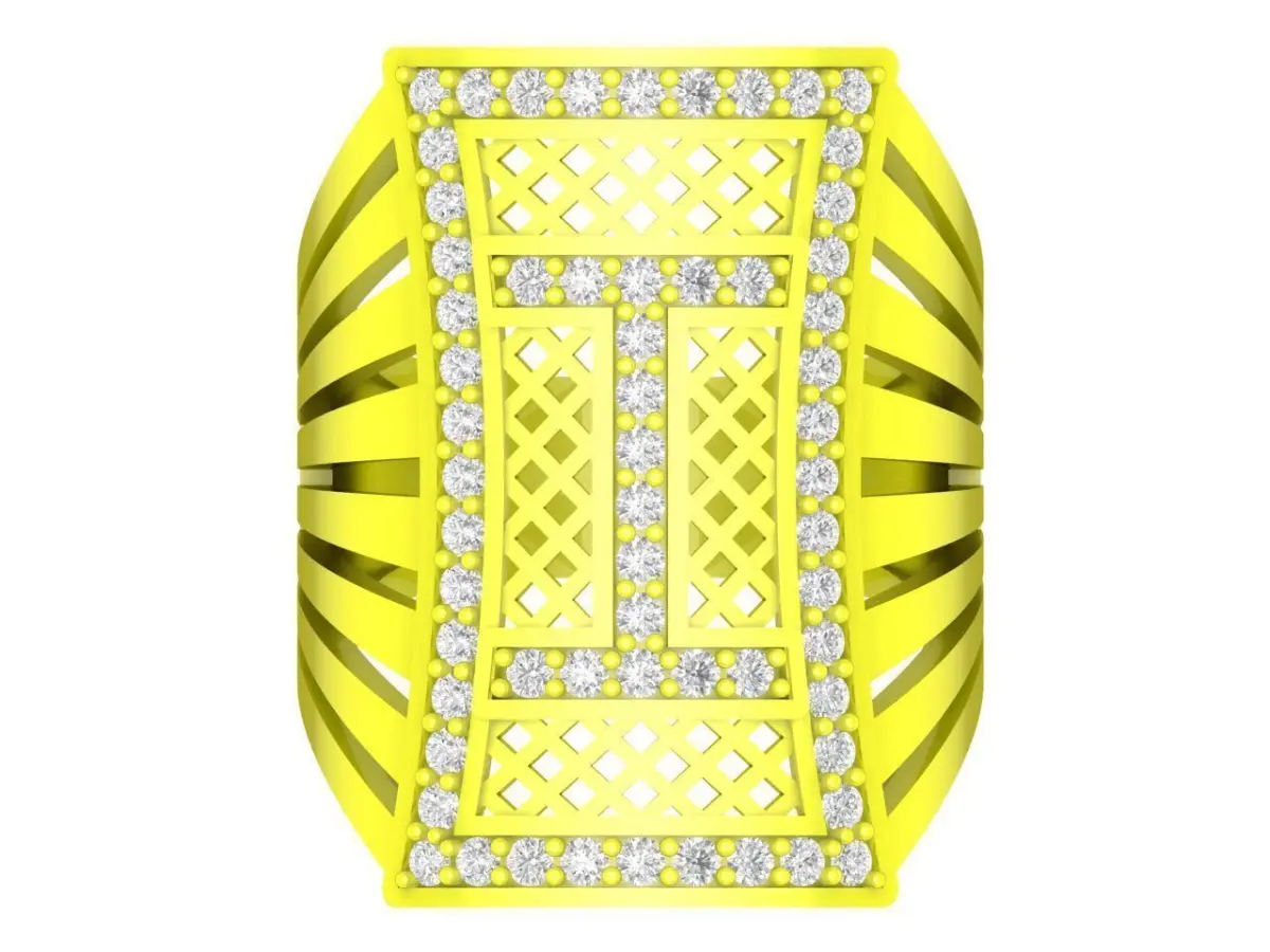 This 3D model features a luxury men’s ring design highlighted by a bold letter “T” centerpiece. The ring combines strong geometric structure with refined pavé detailing, creating a powerful and modern appearance suitable for men’s jewelry collections.