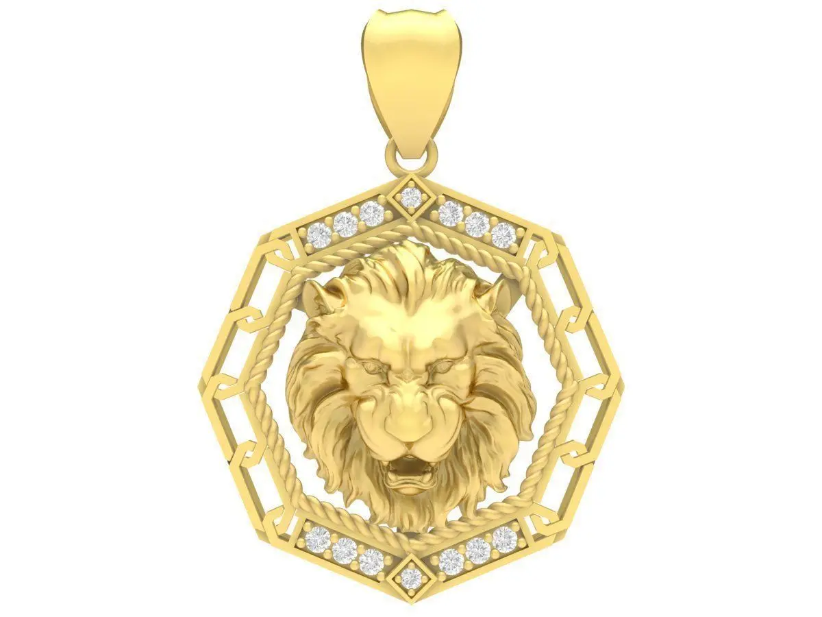 This luxury lion head pendant jewelry design features a bold sculpted lion head positioned at the center of a geometric octagonal frame. The lion symbolizes strength, courage, authority, and protection, making this design especially suitable for statement jewelry and masculine or unisex collections.