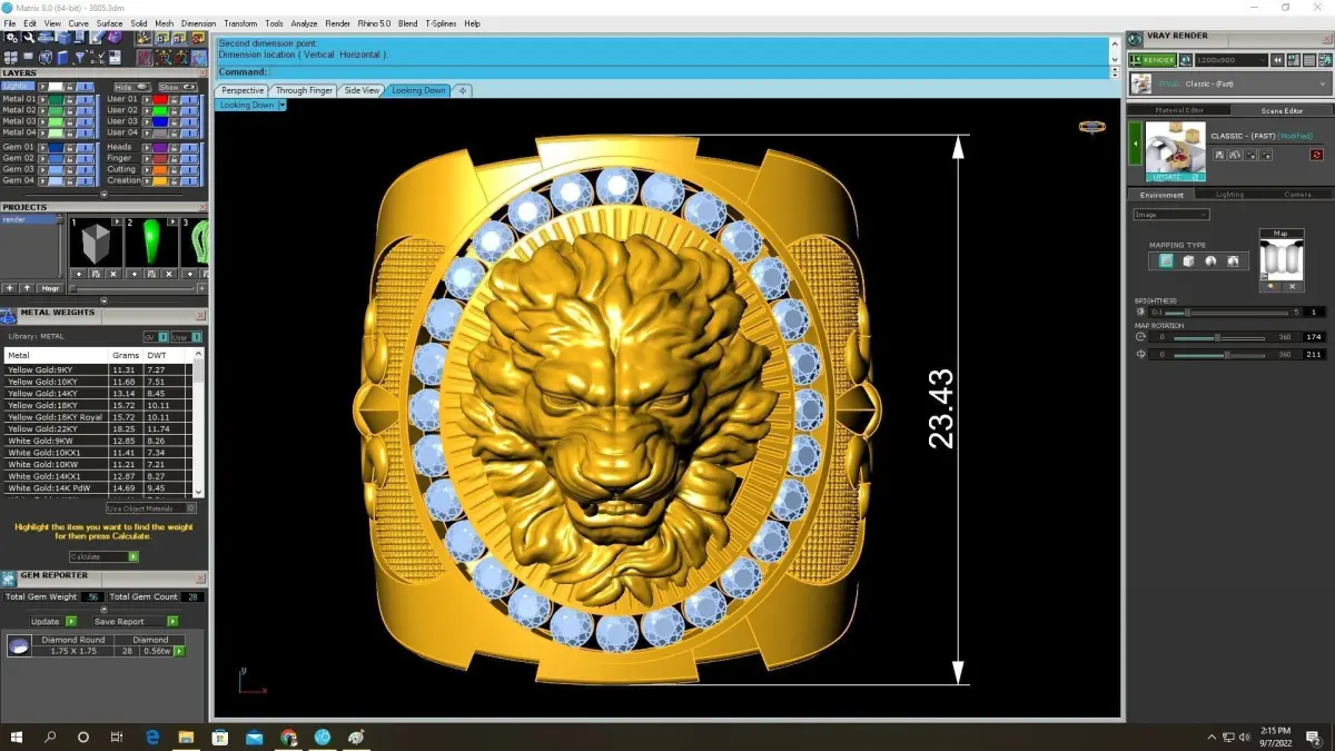 The ring features a highly detailed sculpted lion head surrounded by a halo of gemstone settings, enhancing its bold and prestigious appearance. The strong shank structure provides visual balance and durability, suitable for premium jewelry production.
