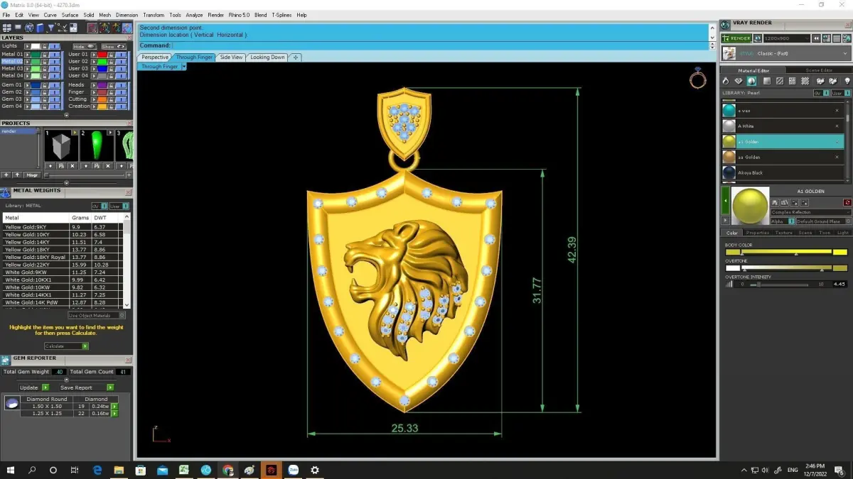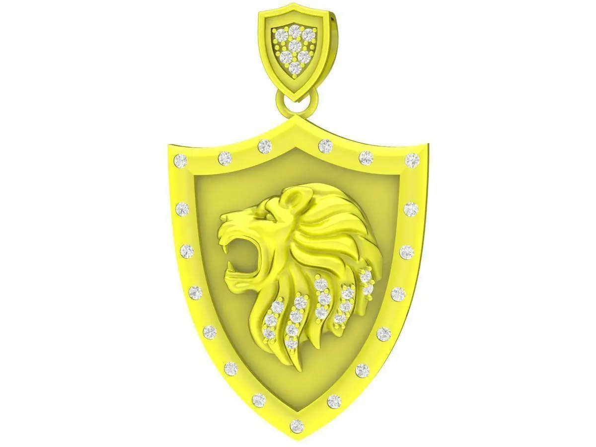 This luxury lion shield pendant 3D model features a bold shield-shaped design highlighted by a finely sculpted lion head emblem at the center. The shield symbolizes protection, strength, and authority, while the lion motif represents power and leadership. A refined row of accent stones along the border enhances brilliance and gives the pendant a prestigious, high-end appearance.