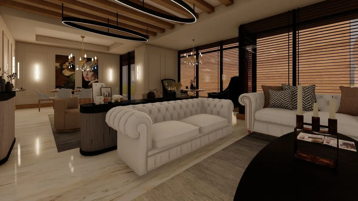 This detailed 3D model of a luxurious living room is perfect for use in high-end interior design visualizations, architectural renderings, and virtual staging projects. The model features elegant furniture, including tufted white sofas, a designer dining table, custom art pieces, and a stunning wooden ceiling with modern black pendant lighting. The carefully arranged interior blends classical and contemporary elements with luxurious materials and textures. Suitable for professional designers, architects, or 3D artists, this model can be fully customized to fit various room layouts and design aesthetics.