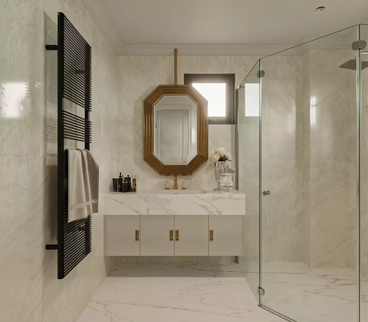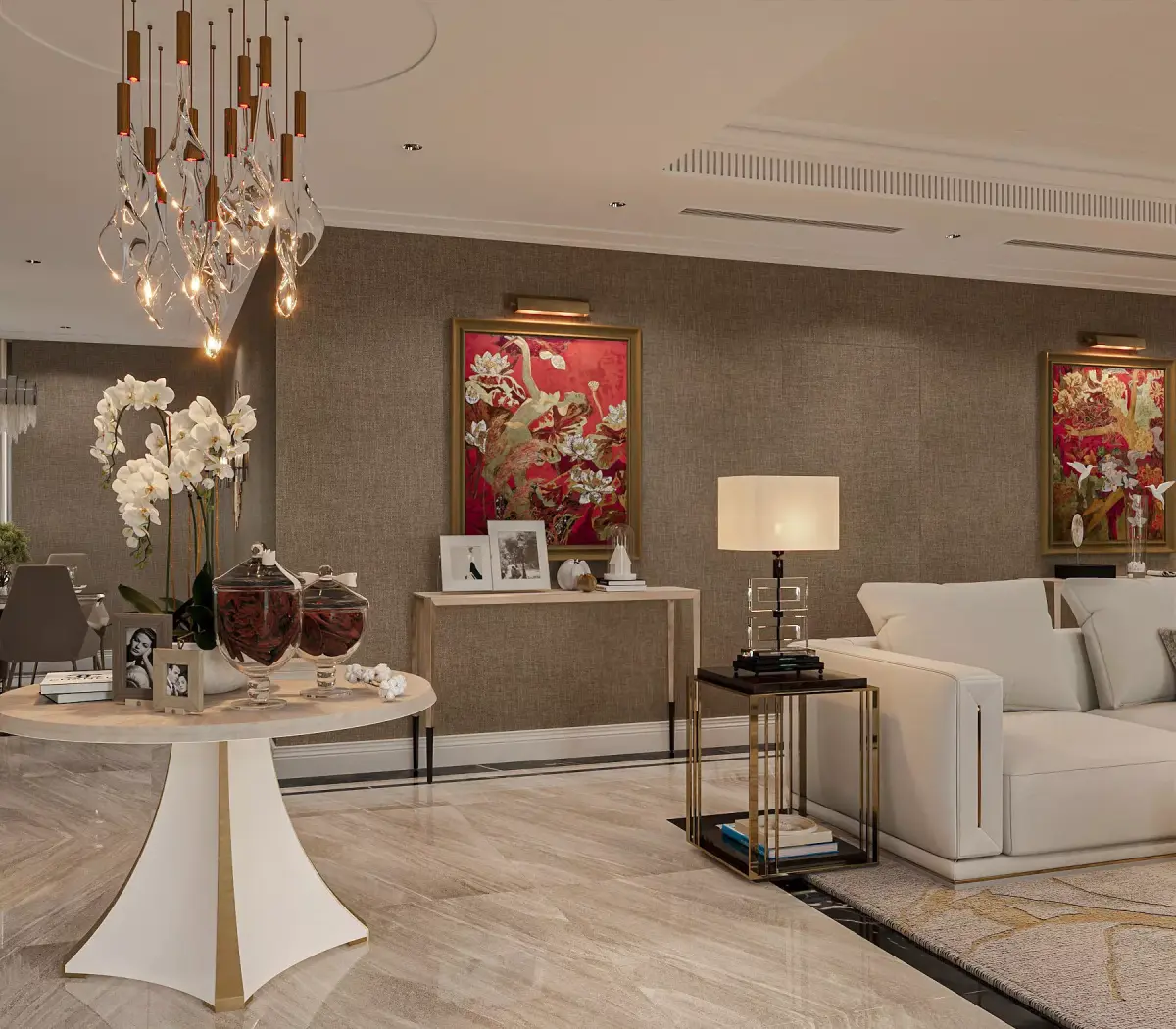 This luxurious living room embodies modern elegance with a touch of timeless sophistication. Featuring plush white sofas, a striking crystal chandelier, and a sleek marble coffee table adorned with vibrant red roses, the space exudes both comfort and grandeur. Warm ambient lighting from the table lamps creates a welcoming atmosphere, while the soft patterned rug ties the entire room together with subtle harmony. The mirrored wall and fireplace add depth and refinement, making this living room not only a place to gather but also a statement of luxury lifestyle.