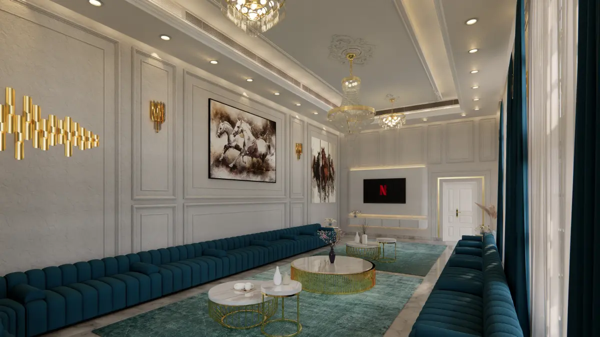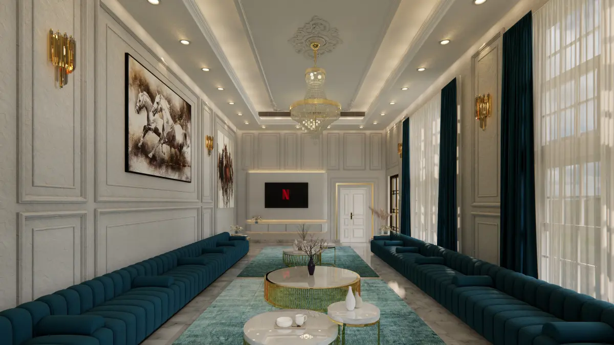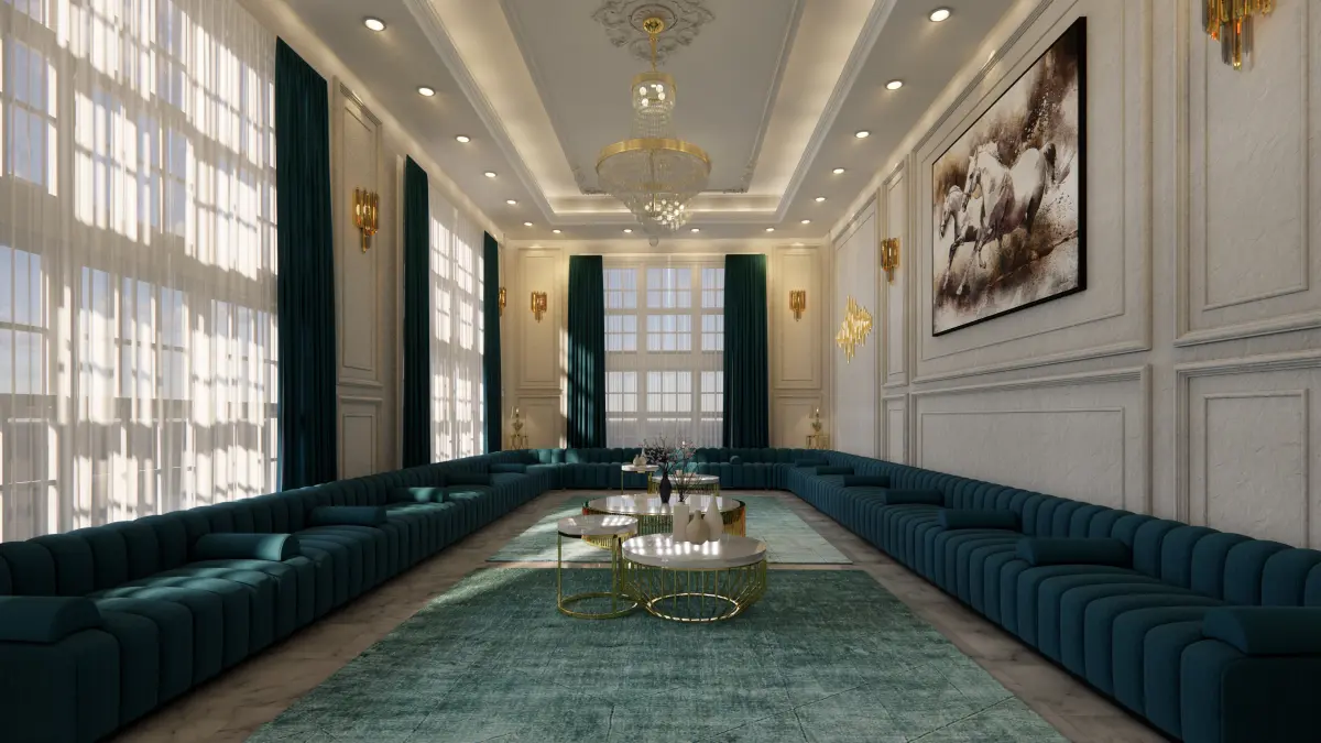 Classic Luxury Majlis Interior DesignThis 3D model presents a classic and luxurious majlis designed with traditional Arabic elegance blended with high-end materials and refined detailing. The space features ornate wall panels, premium upholstery, golden accents, custom lighting, and symmetrical seating layout that highlights formality and hospitality.It’s ideal for formal gatherings and cultural settings, reflecting a timeless aesthetic rooted in Middle Eastern heritage. The design emphasizes harmony, richness in materials, and a warm, welcoming ambiance.