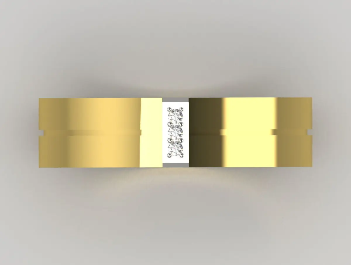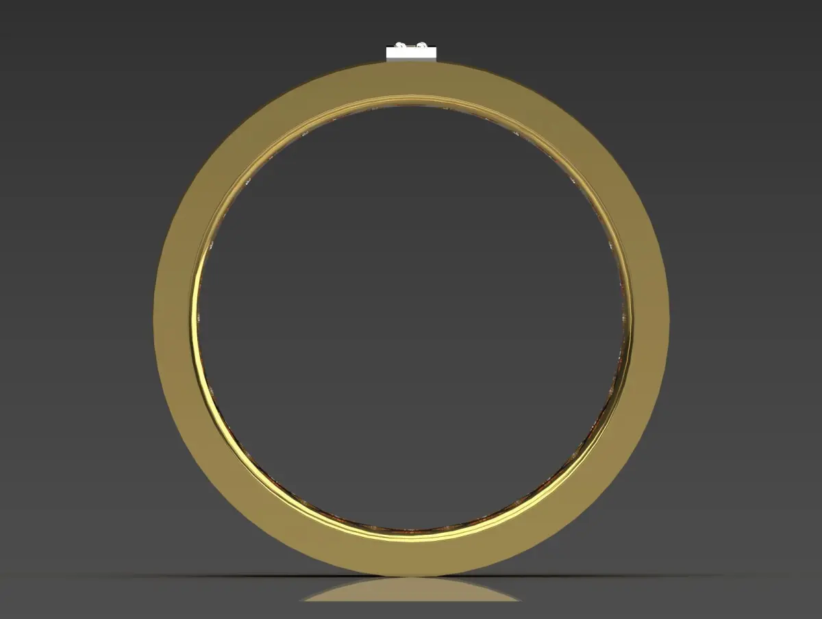 The image shows a luxurious gold ring with a polished exterior design. The surface features a broad, smooth band adorned with a central section decorated with small, sparkling diamonds embedded in a white metal strip. The inner side of the band has a geometric lattice or filigree pattern, adding an intricate decorative element to the ring, which enhances its elegance and craftsmanship.