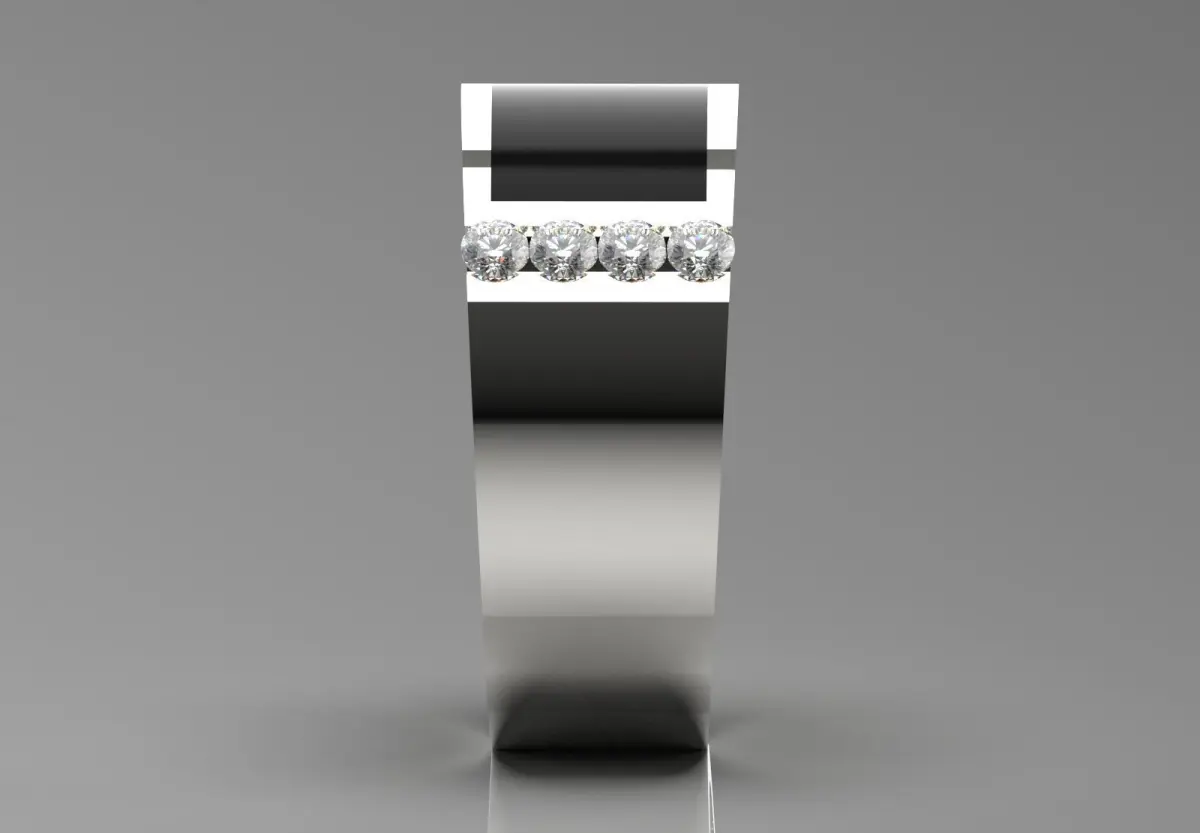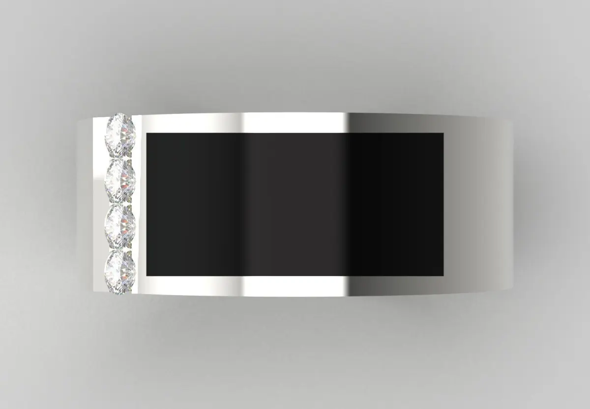 Gems: Four small round brilliant cut diamonds arranged in a linear and diagonal manner in the lower corner of the black band.