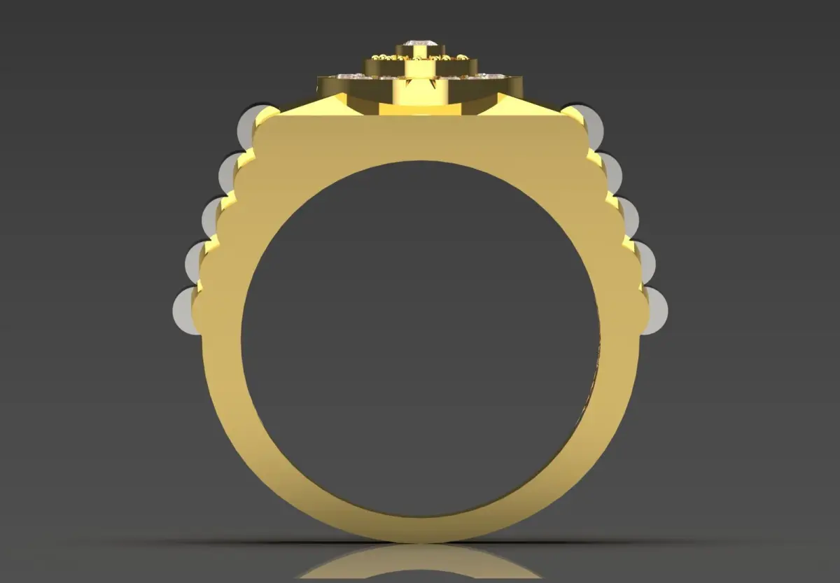 - Silver metal (likely white gold or platinum): The wide, parallel bands on one side of the ring are made of a shiny silver-colored metal that creates an attractive contrast with the yellow gold.