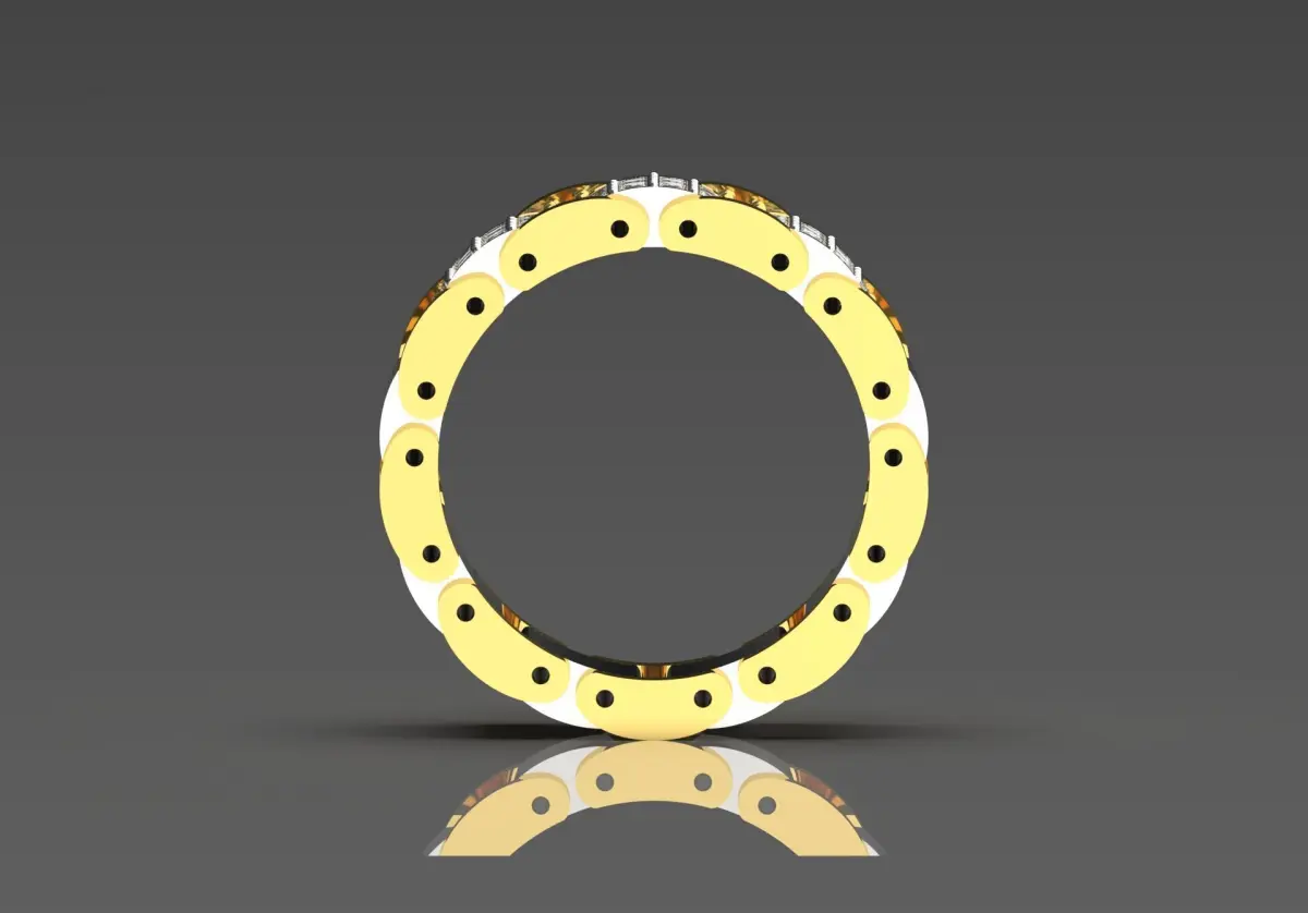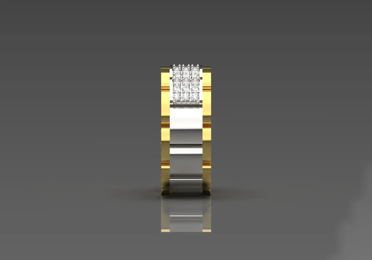 This ring has a unique and modern design that is characterized by the combination of yellow and white gold colors. Its structure is in separate sections that contain shiny yellow and white gold parts that create a striking visual contrast.