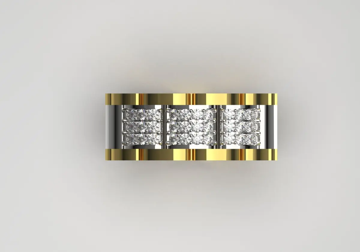 The center of the ring is decorated with a row of sparkling stones that are diamond-type and are placed in a horizontal channel in the middle. This feature adds a touch of beauty and elegance to the overall appearance of the ring. The shiny surface of the ring also enhances its shine, making it suitable for use in both informal and formal occasions.