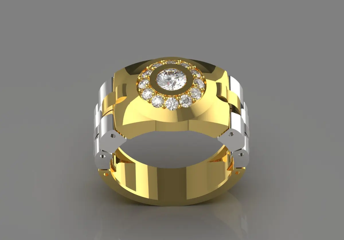 Rolex Jewelry Ring Dimensions: See pictures for details or contact usThis men's ring with a unique and luxurious design is a symbol of power and style. The body of the ring is made of high quality metals and its golden shine along with silver details gives it a special and attractive effect.