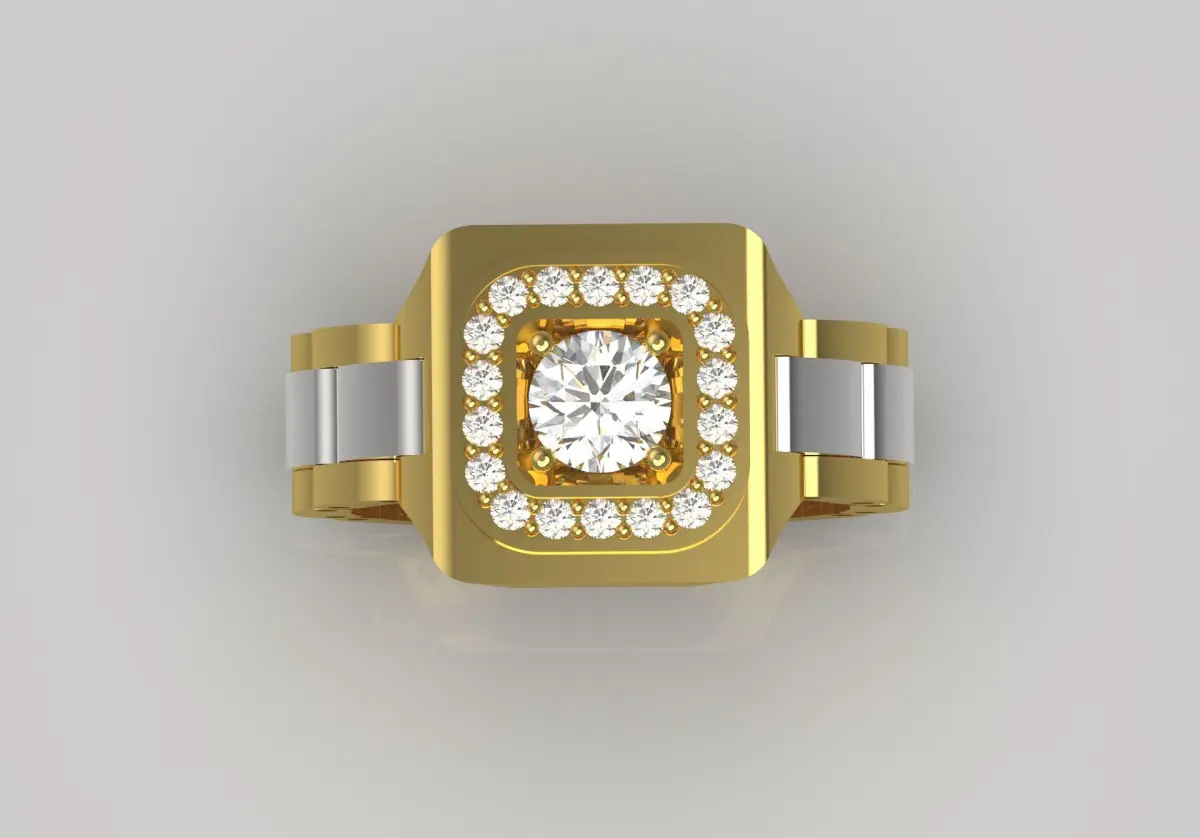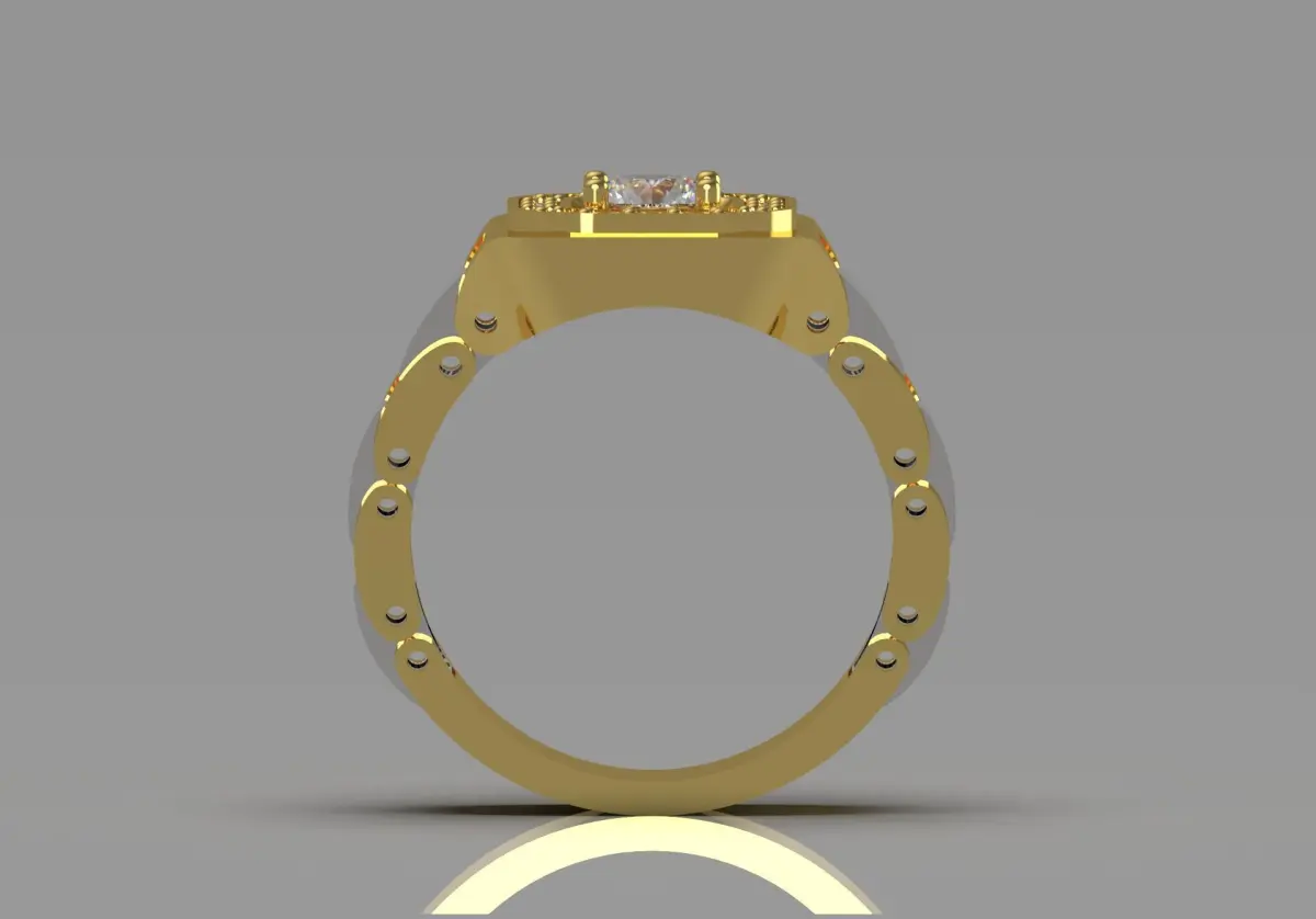 This ring features a striking square design with a large, sparkling diamond at its center. The center diamond is surrounded by a number of smaller diamonds that enhance its sparkle and prominence. The band is a combination of yellow gold and white gold, creating a bold contrast. The band has a unique, modern link style that adds to its contemporary appeal. The gold plating is polished and shiny, giving the ring a luxurious look. Overall, this piece combines elegance and modernity, making it a stunning statement accessory.