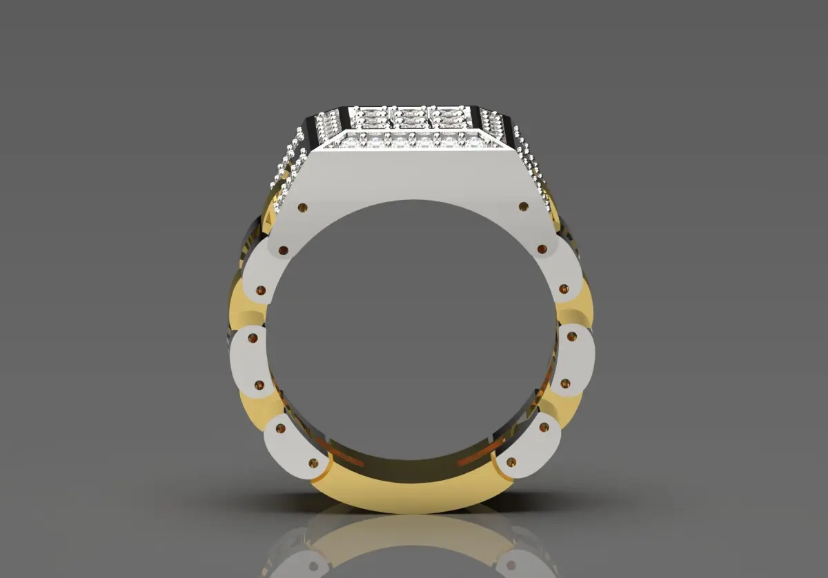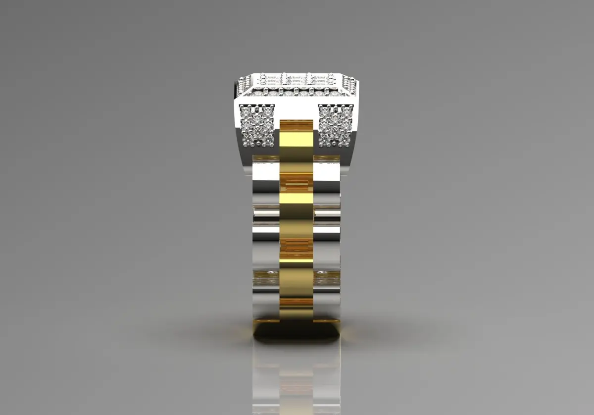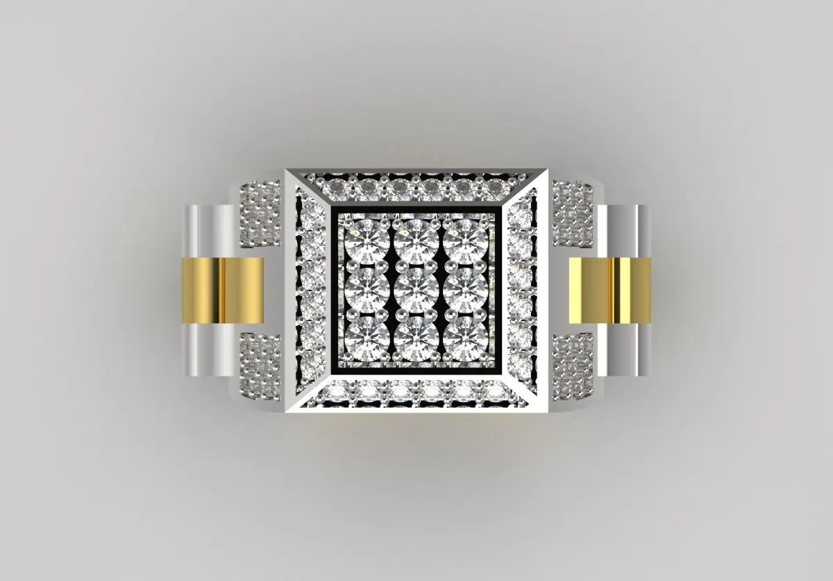 This ring features a bold and modern design with a square face adorned with multiple sparkling diamond-like stones, giving it a luxurious look. The band of the ring is two-tone, featuring polished white gold and yellow gold, adding striking contrast. The overall look combines elegance with a contemporary edge, making it perfect for formal and elegant occasions. The intricate detailing and unique geometric shape make for a piece that will stand out on the finger.