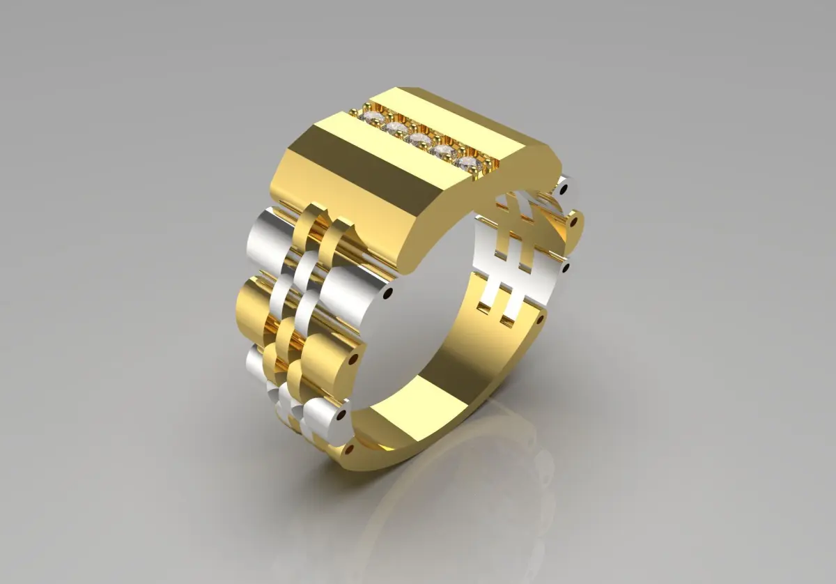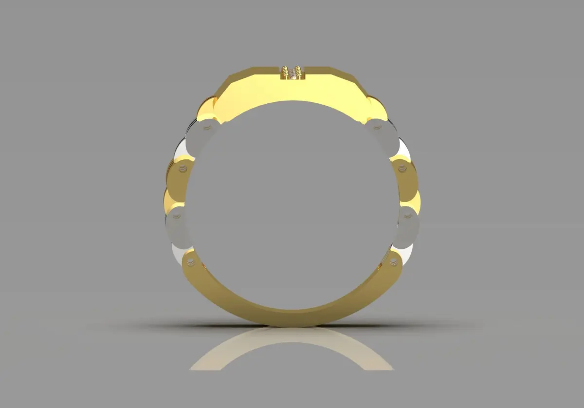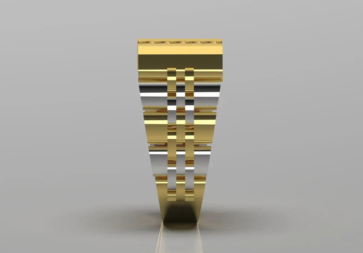 - See images for details or contact us- This ring features a bold and modern design that combines two-tone gold metal. The top features a shiny gold surface with horizontal stripes that are interspersed with small, sparkling stones that are diamonds, creating a subtle glow.- The band transitions into a series of round, polished white gold links that add unique texture and visual appeal. These links are arranged in a layered, wavy pattern, adding dimension and depth to the ring.- Overall, the combination of yellow and white gold, along with striking design elements, makes this ring a standout piece that balances a contemporary aesthetic with a touch of luxury, suitable for both casual and formal occasions.