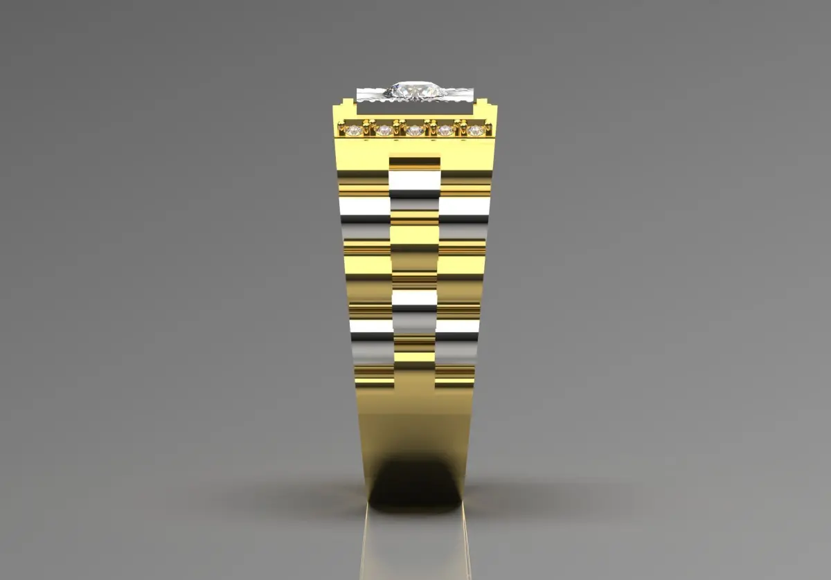 The arm itself features a distinctive two-tone effect that alternates between yellow gold and white gold sections. The sides of the band are crafted with interlocking links that contribute to its modern and designer look. Overall, this ring combines luxury with contemporary style, making it a standout piece.