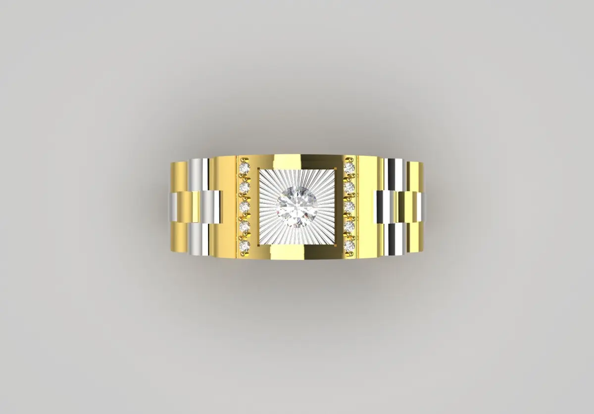 At the top, it features a prominent rectangular face adorned with a sparkling center diamond, surrounded by sunburst engravings that add texture and visual interest. Above the diamond, there is a row of smaller diamonds that elevate its elegance.