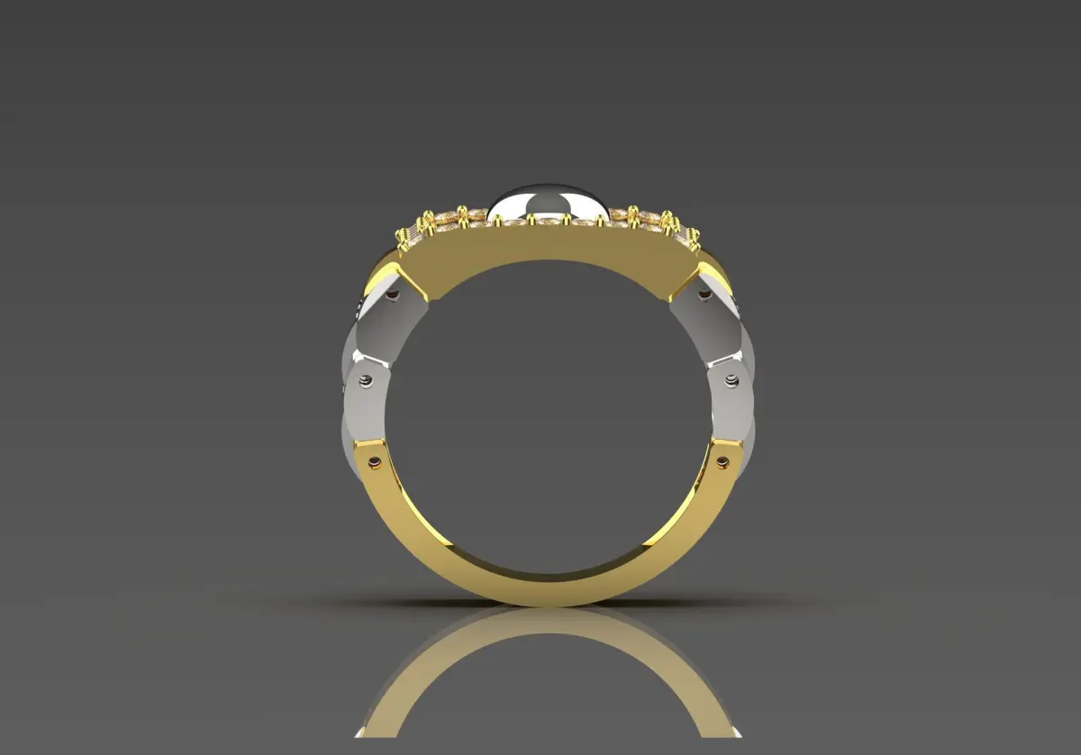 The sides of the arm feature an interlocking, segmented structure that adds contemporary flavor and visual interest. The polished finishes highlight the ring’s luxurious appeal, making it a piece that is perfect for special occasions or as a fashion accessory. Overall, this ring balances elegance with a modern edge, appealing to those who appreciate unique jewelry designs.