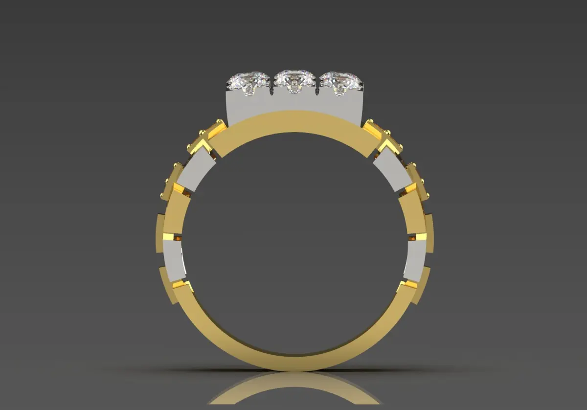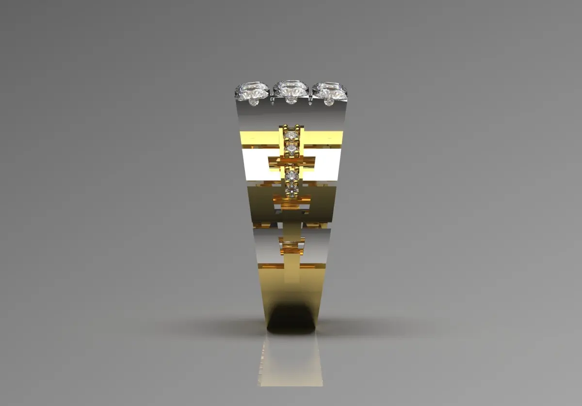 The arm itself is uniquely constructed, featuring interlocking sections that alternate between yellow and white gold. This gives the ring a modern, architectural feel. The small, sparkling sections on the sides add a touch of elegance to the ring and enhance the overall visual appeal of the ring. The shimmering finishes of each gold tone reflect light, making this piece an eye-catching accessory for a variety of occasions.