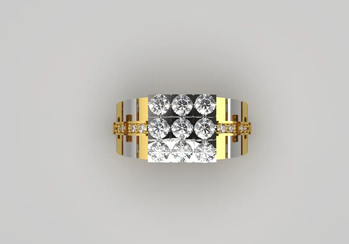 This ring showcases a striking, contemporary design featuring a square top adorned with a grid of 9 brilliant-cut diamonds. The square surround is framed in gleaming white gold, which contrasts beautifully with the gleaming, polished yellow gold arm.