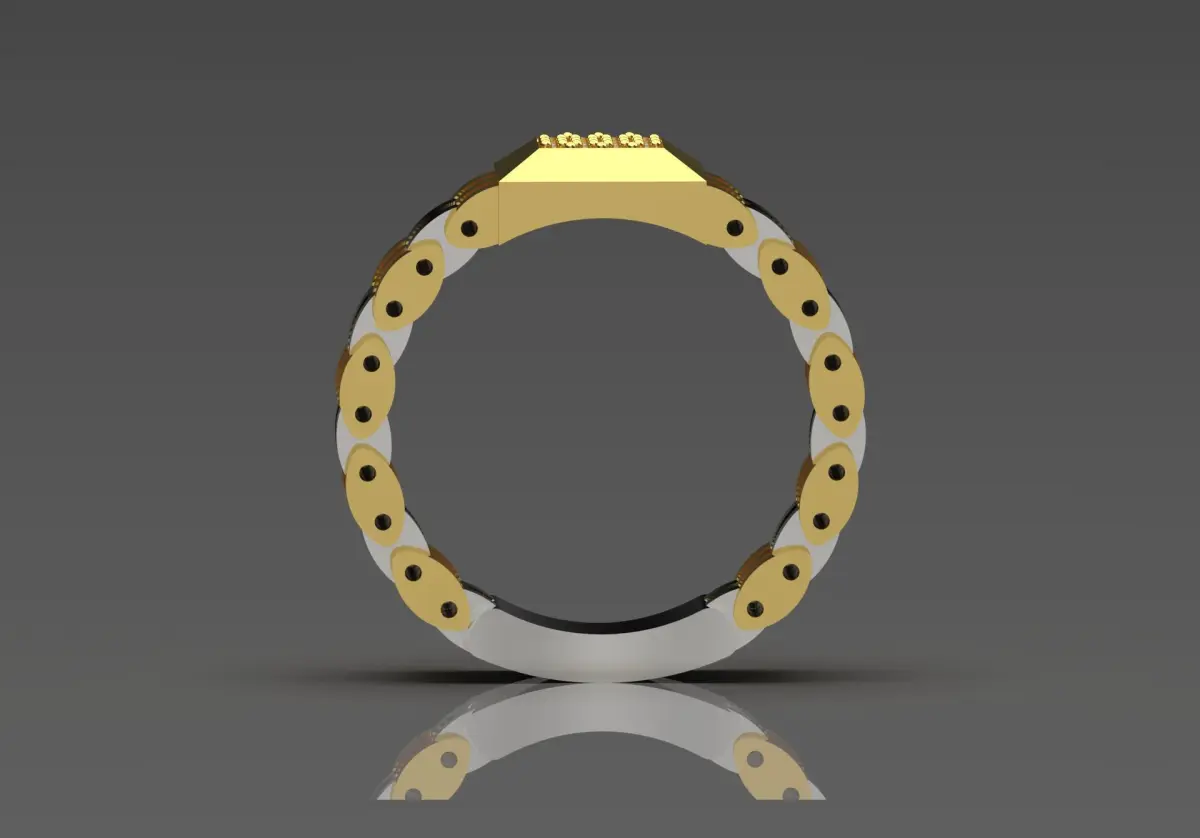 This arm is uniquely crafted with a chain-like look that alternates between shiny yellow gold and white gold. Each link has a rounded design that gives it a flexible and comfortable fit. The shiny gold finish reflects light beautifully, making this ring an eye-catching statement piece. Its contemporary aesthetic combines elegance with a bold, industrial vibe, perfect for those looking to make a fashion statement.