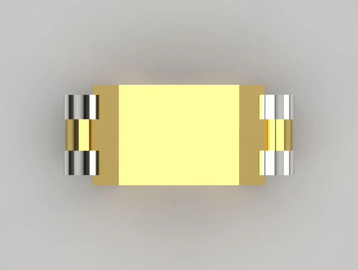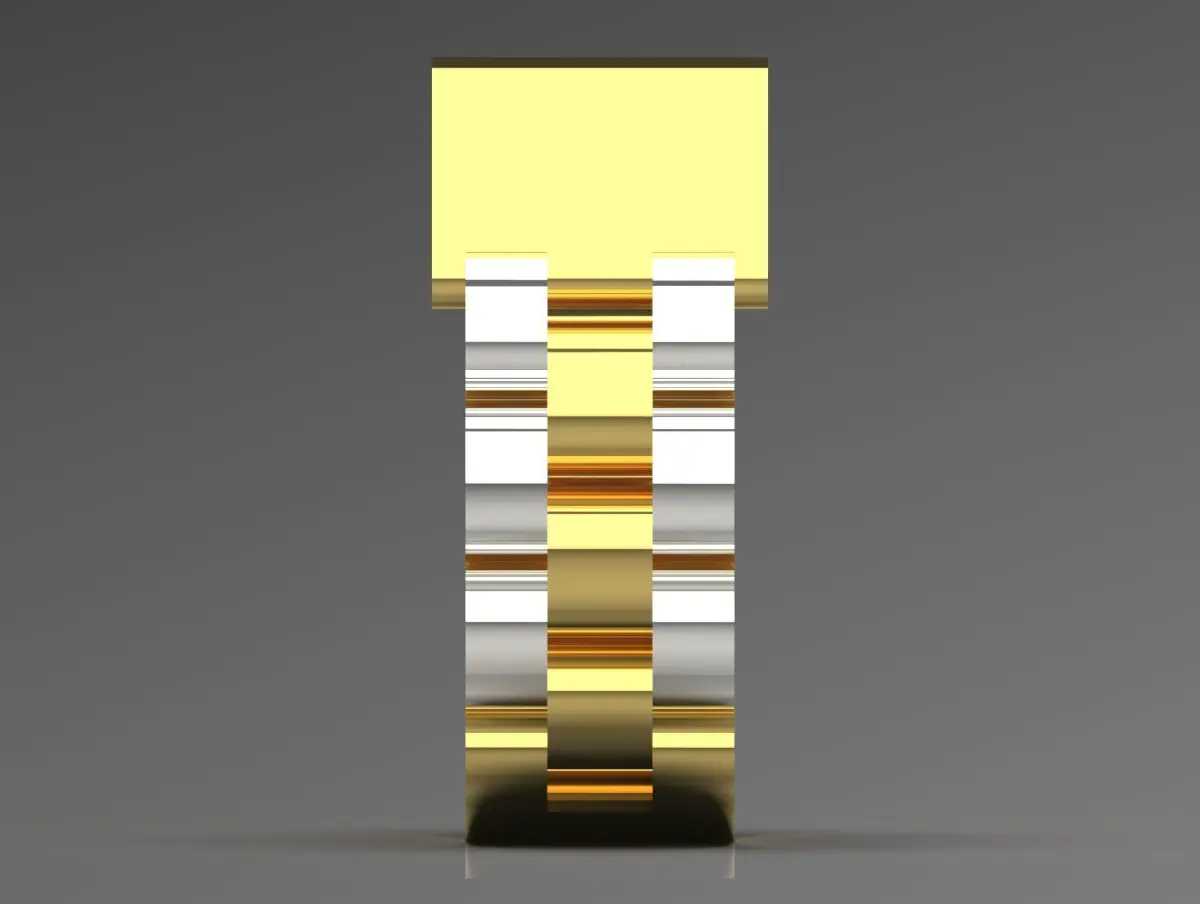 This image appears to be a 3D rendering of a mechanical or jewelry component, possibly a ring, with a modern, futuristic design. The ring features a combination of metallic finishes, with parts in shiny silver and gold tones. Its design incorporates geometric cutouts and a unique structure that resembles a circuit or mechanical motif, creating an intricate and complex visual appearance. The background is a plain, gradient grey, emphasizing the reflective and metallic qualities of the ring.