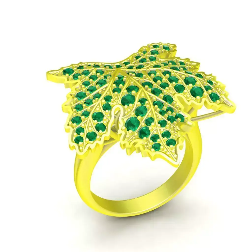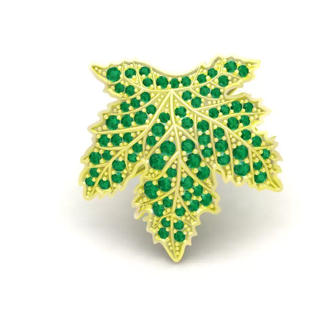 This luxury maple leaf emerald pavé ring 3D model features an elegant nature-inspired design with a detailed leaf silhouette. The entire leaf surface is fully set with precision pavé emerald stones, following the natural vein structure to create depth, brilliance, and organic movement.