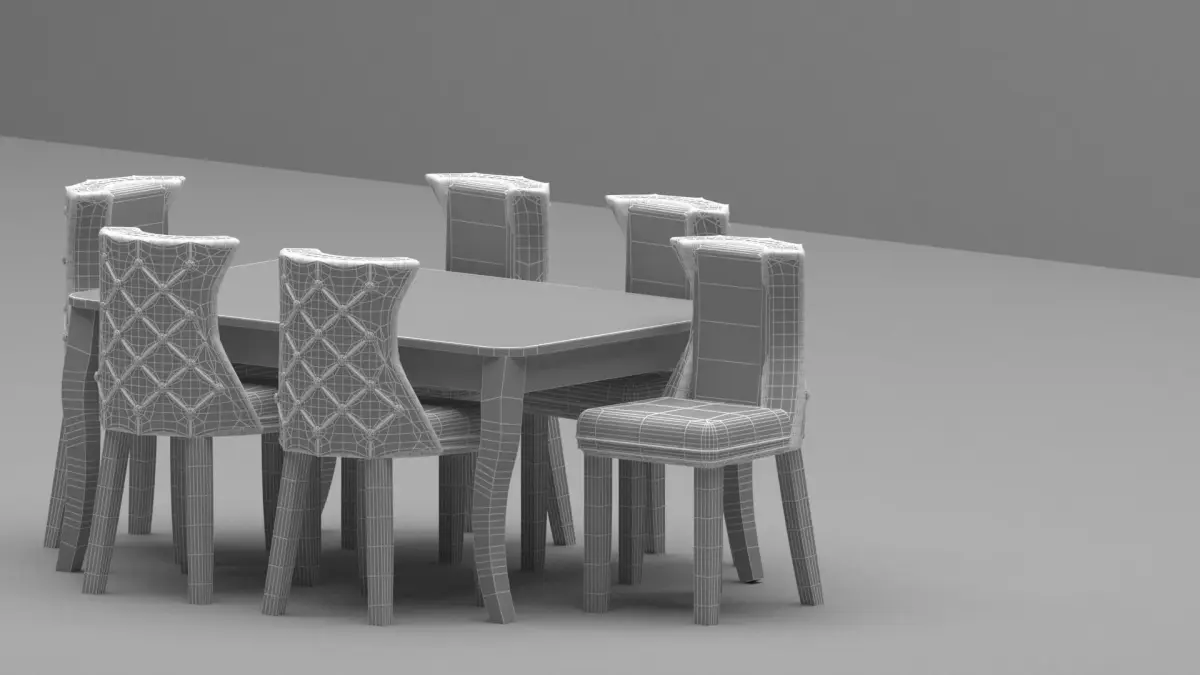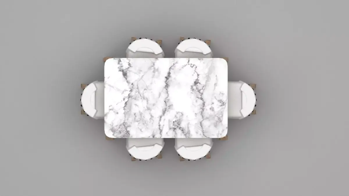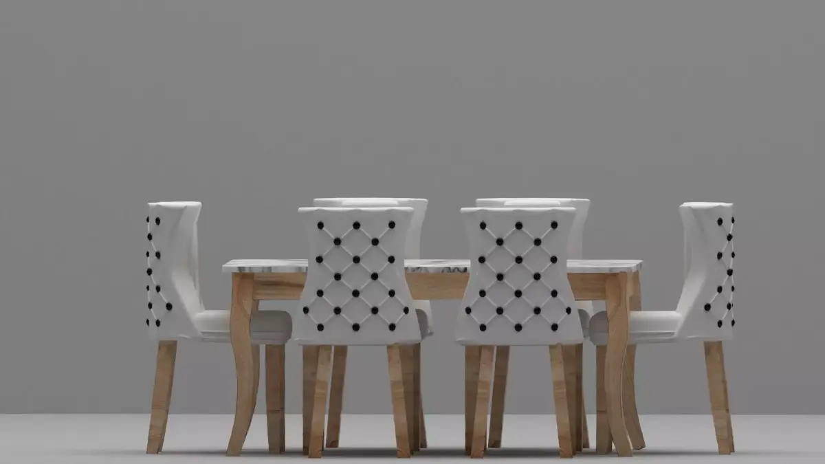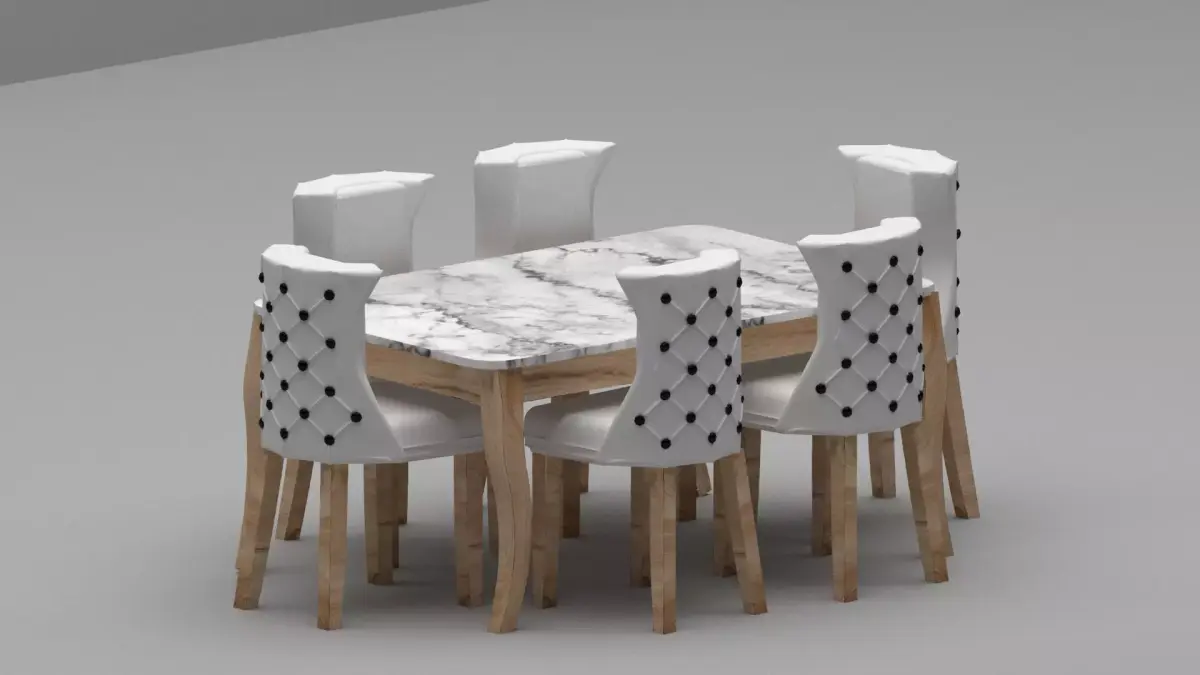 This 3D model represents a luxury dining table set featuring a white marble tabletop combined with wooden legs and six upholstered chairs. The chairs include button-tufted backrests and smooth curves, giving the design a blend of modern and classic elegance.