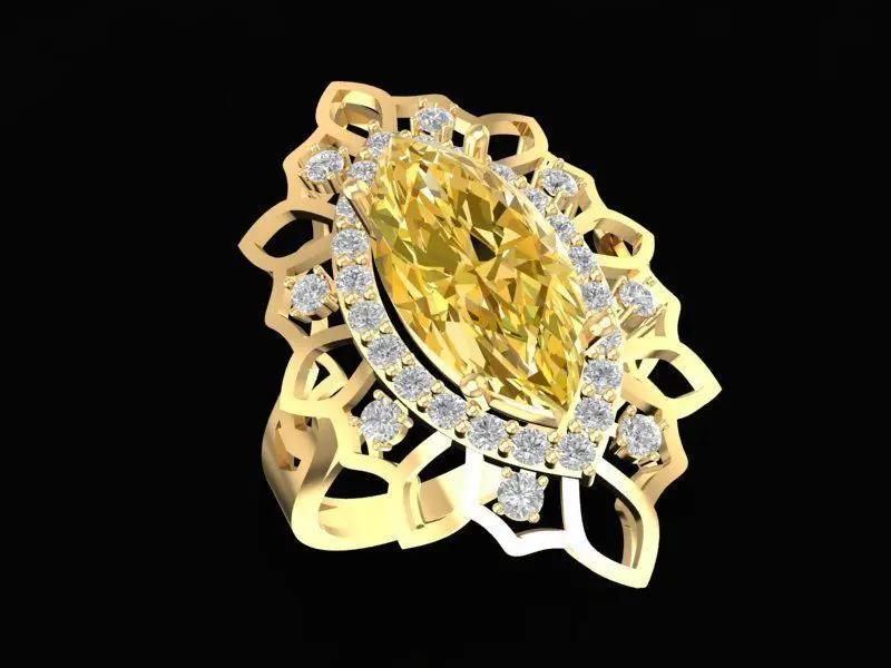 This elegant 3D jewelry model showcases a luxurious marquise-cut gemstone ring surrounded by a sparkling halo of small accent stones. The central gemstone — available in emerald, yellow sapphire, moissanite, or diamond — adds a striking focal point to the design, while the geometric halo enhances its brilliance and sophistication.