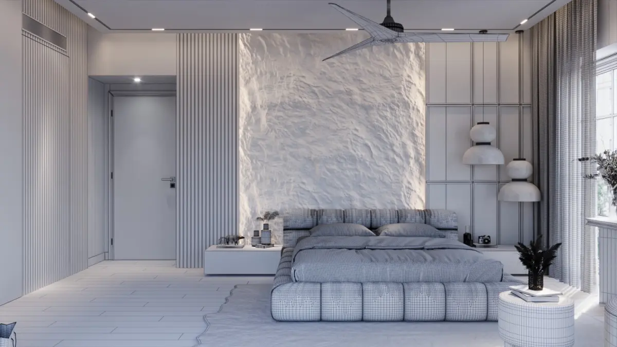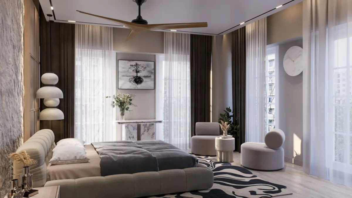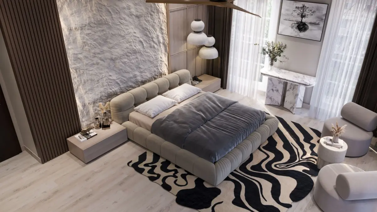Luxury Master Bedroom with Luxury Bed and Bedback (PU Stone Finish in Centre, Wooden Square Pattern on right side and Wooden Flutes on left side).Beautyful black & white rug. Sitting in corner. Dresser with round mirror. Hidden(Fluted) washroom door. Green plants for freshness.