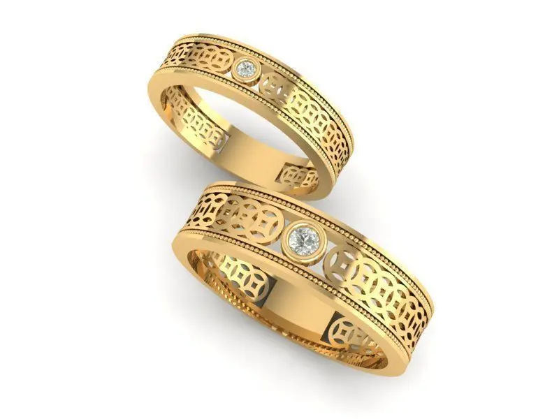 This 3D jewelry model features luxury matching couple rings designed with elegant engraved borders and a single diamond accent in the center. The pattern runs smoothly around the band, giving the design a timeless and sophisticated appeal suitable for both men and women.