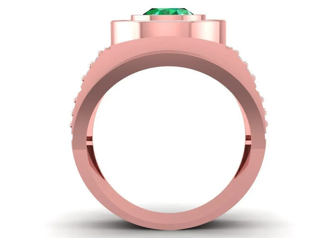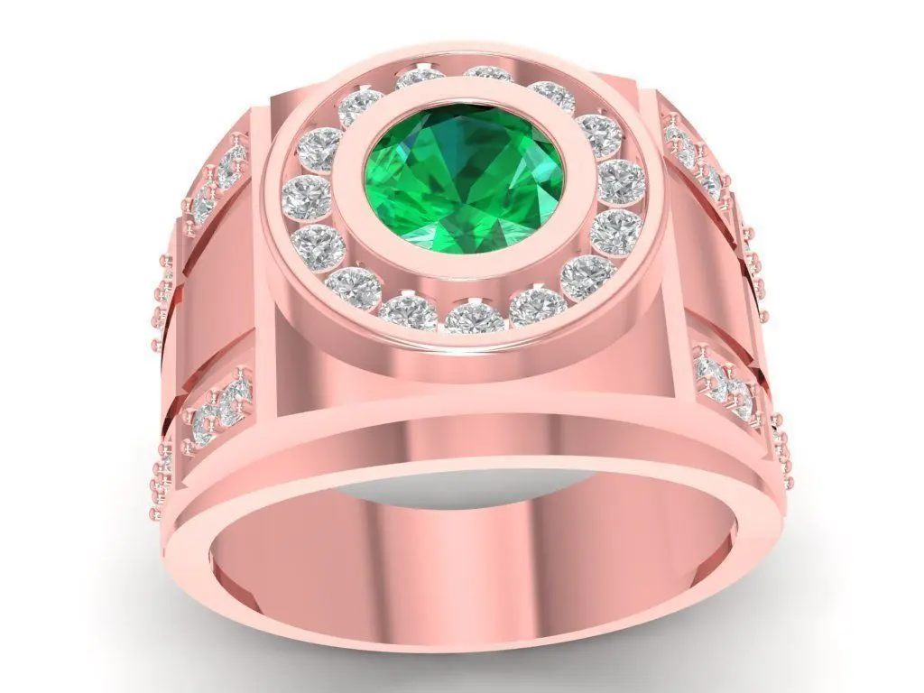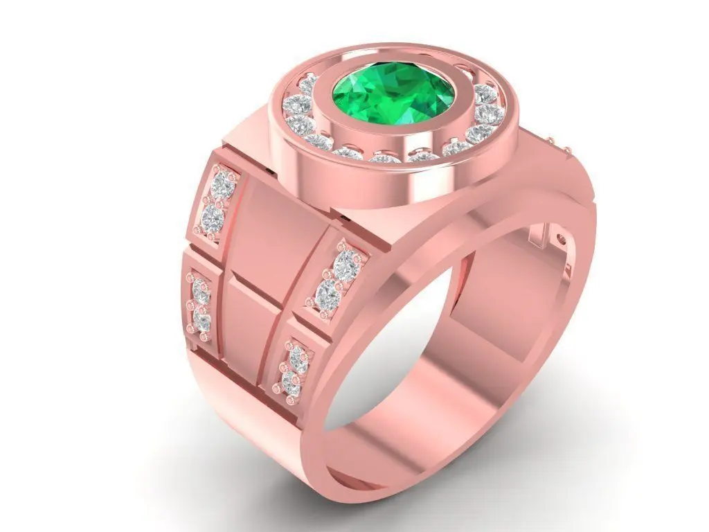 This 3D model showcases a bold and luxurious men’s signet ring designed around a striking round center stone. The ring features a powerful geometric structure with wide shoulders, accented by multiple rectangular stone settings that enhance both brilliance and masculine aesthetics. The raised center bezel highlights the main gemstone, while the surrounding pavé details add dimension and a premium finish suitable for fine jewelry collections.