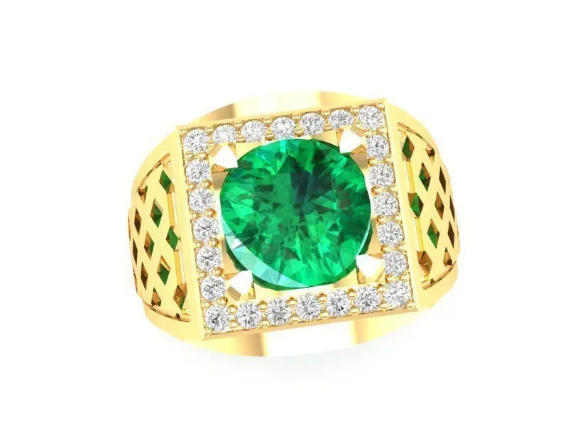 This 3D jewelry model showcases a luxury men's signet ring featuring a bold round center gemstone, presented in emerald or ruby variations, surrounded by a sparkling diamond halo. The geometric latticework design on the shank enhances airflow and reduces weight while adding a modern aesthetic. The combination of the vibrant center stone and the pavé-set halo diamonds creates a striking and elegant look.