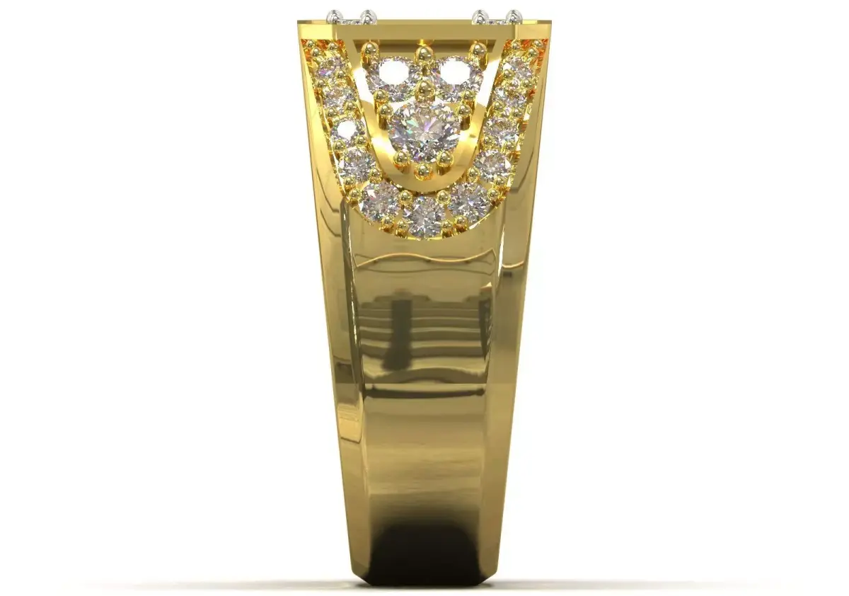 - Glossy Yellow Gold Metal: The entire structure, base and rings of the ring are made of polished and shiny yellow gold, which creates a beautiful contrast with the white sparkle of the diamonds.