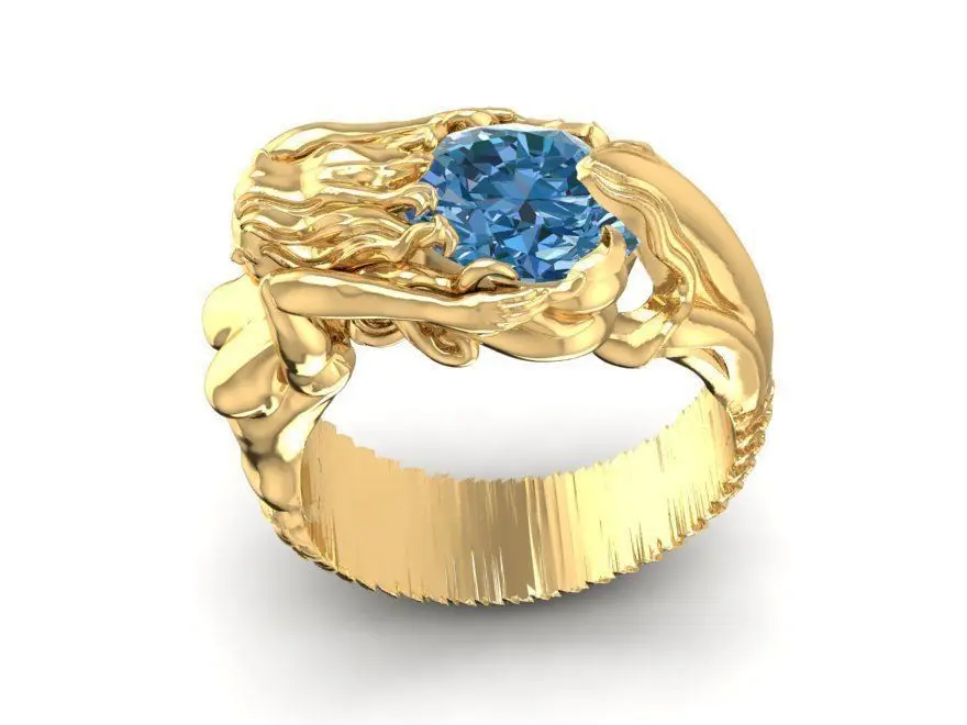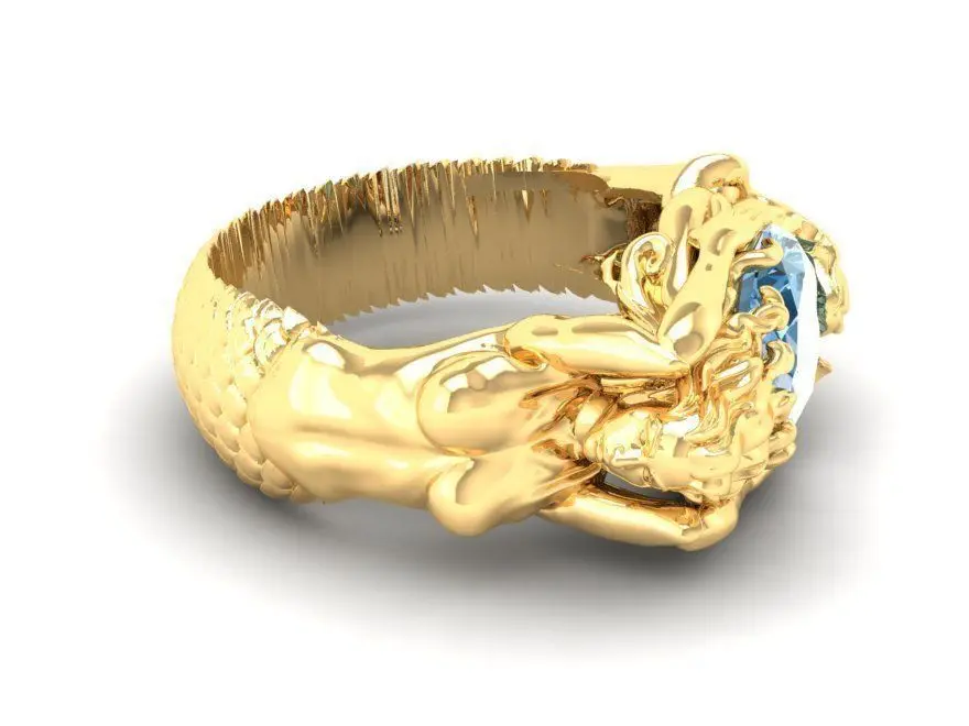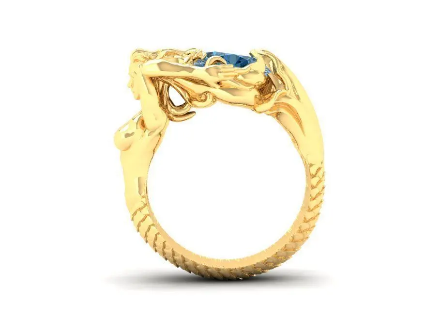 This luxury ring design features an artistic mermaid sculpture gracefully wrapping around the band, symbolizing beauty, mystery, and the spirit of the ocean. The flowing mermaid form is sculpted with smooth, organic curves and detailed contours, creating a dynamic and elegant three-dimensional composition. A blue gemstone is carefully set as a focal point, enhancing depth, brilliance, and visual contrast.
