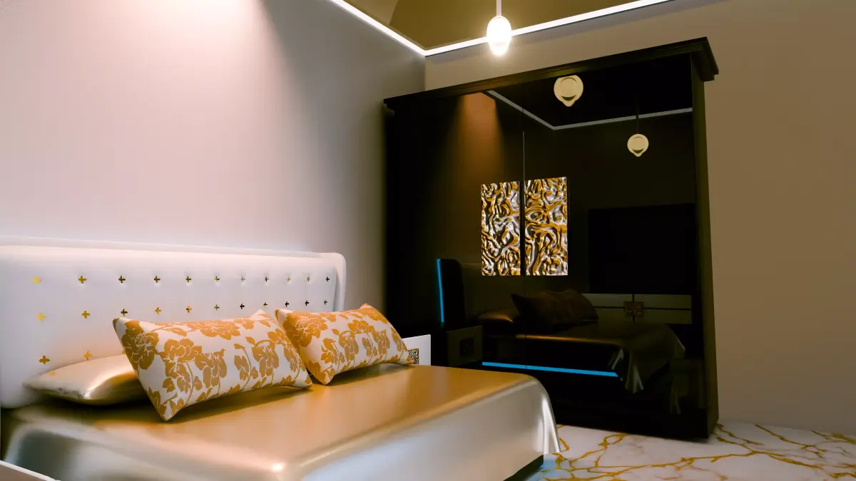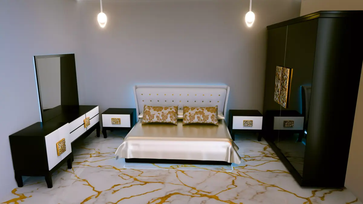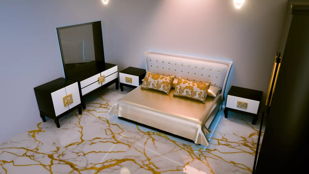 This high-quality 3D scene includes a contemporary bed with a padded headboard and gold detailing, elegant pillows, a reflective black wardrobe with lighting accents, and marble flooring.Perfect for use in interior visualization, animation, or architectural renders.