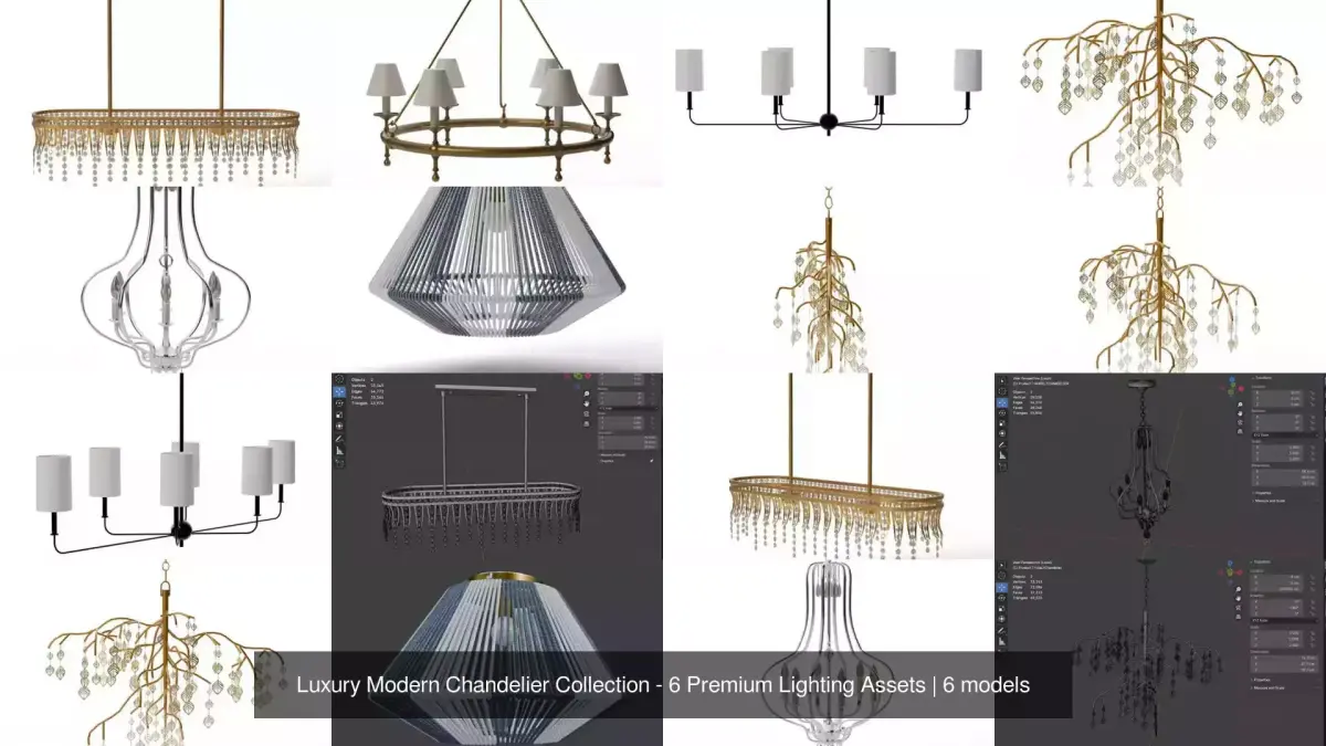 Elevate your interior renders with this curated collection of 6 high-quality, professional 3D chandelier models. This pack features a diverse range of styles, from the classic elegance of rubbed antique brass to modern linear glass and rustic woven textures.