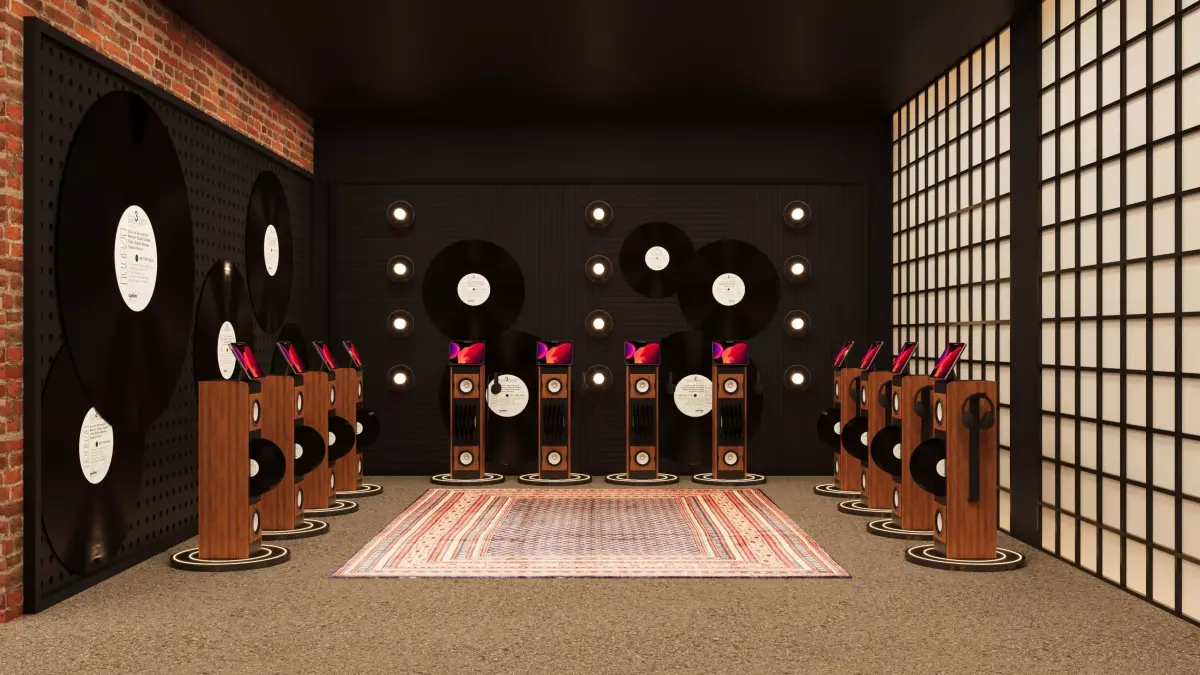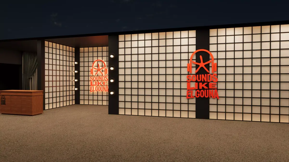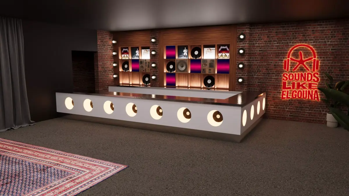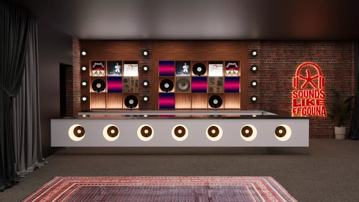 A high-end, detailed exhibition stand and interior concept named Sounds Like El Gouna. This model is perfect for trade shows, commercial events, or luxury interior visualizations. It features a unique blend of industrial brick walls, warm neon signage, and a retro vinyl record lounge.