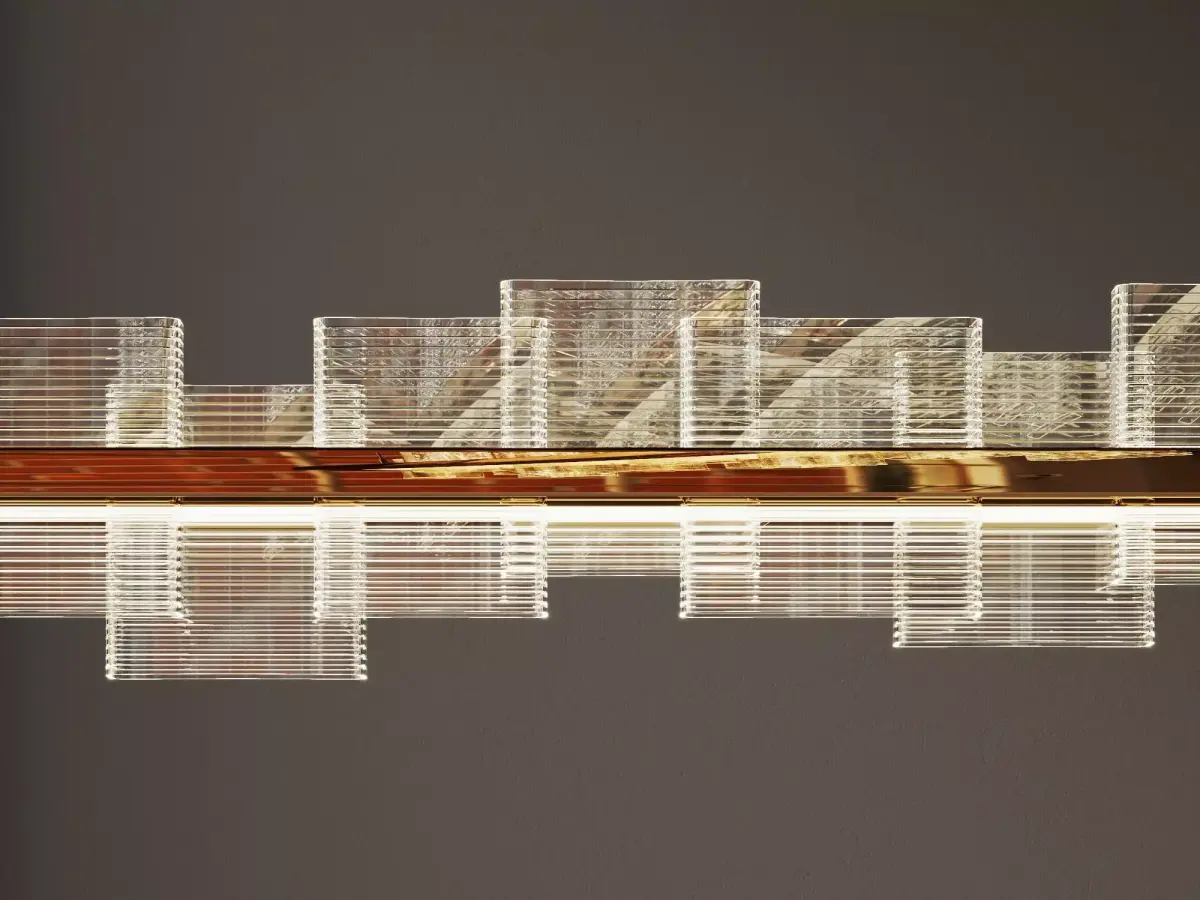 The chandelier features a sleek metal body with a polished brass finish, combined with layered transparent crystal blocks that create elegant reflections and a sophisticated lighting effect. The linear suspended design makes it ideal for long tables, islands, and contemporary architectural interiors.